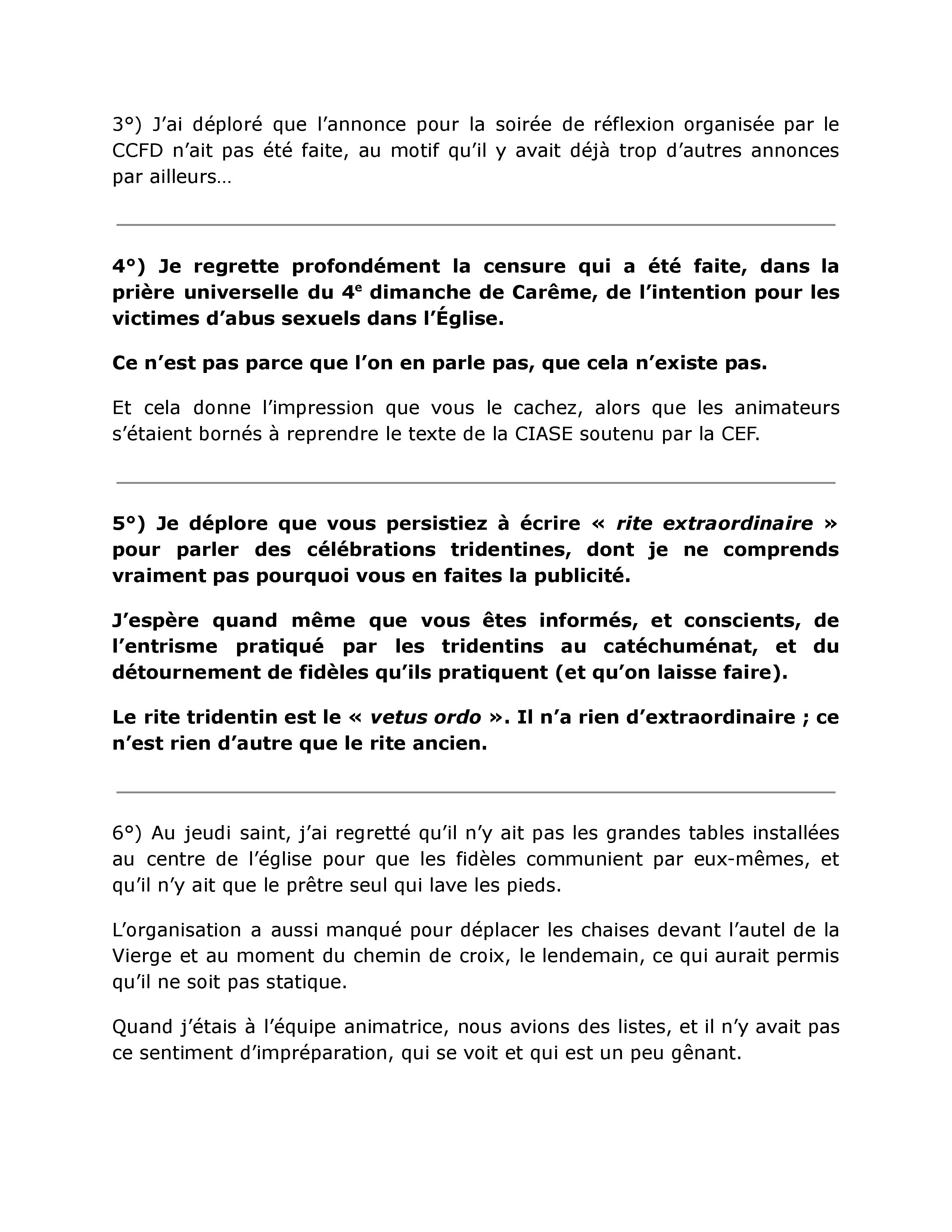 Je voulais vous faire part de plusieurs déceptions concernant les célébrations du Carême et de Pâques 2024.
