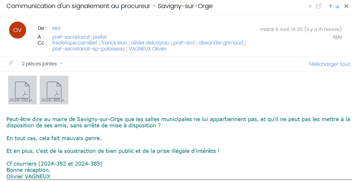 10. Comme il ne s’agit que de la troisième fois depuis le début de l’année 2024, et que nous ne sommes que début avril, ce qui nous donne un bon rythme de « un par mois », il serait peut-être bon d’intervenir pour rappeler à Monsieur le maire de Savigny-sur-Orge qu’il n’est pas au- dessus des lois, et que les salles communales ne lui appartiennent pas ; qu’il ne peut donc pas les privatiser pour ses copains.