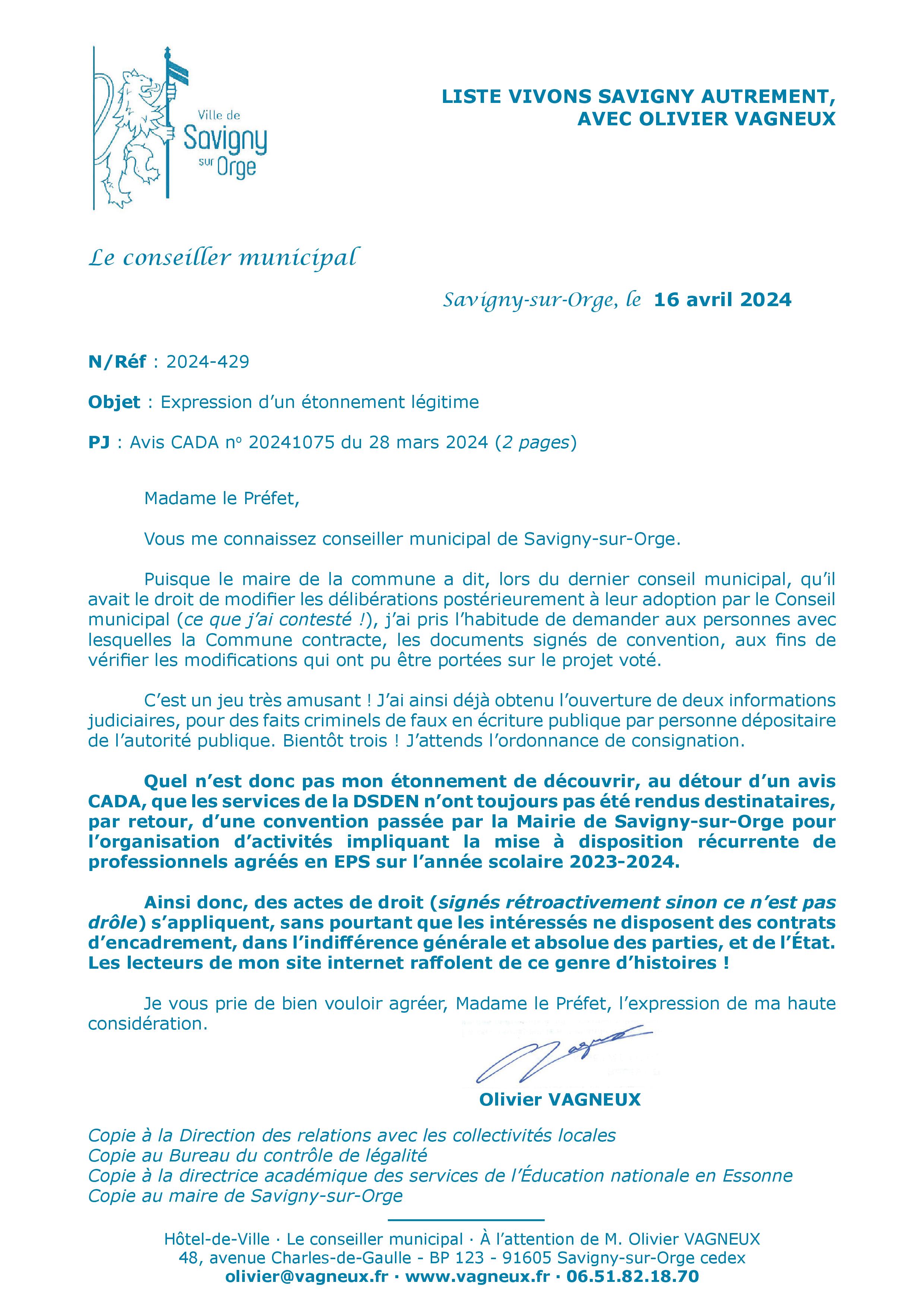 Et c’est ainsi qu’en demandant à l’Éducation nationale de me communiquer la convention qui organise qu’ils mettent à disposition des éducateurs sportifs au profit de la Commune, ils m’ont appris qu’ils n’avaient jamais eu retour de la convention signée !!! Puisqu’ils sont obligés de la demander à la Commune !