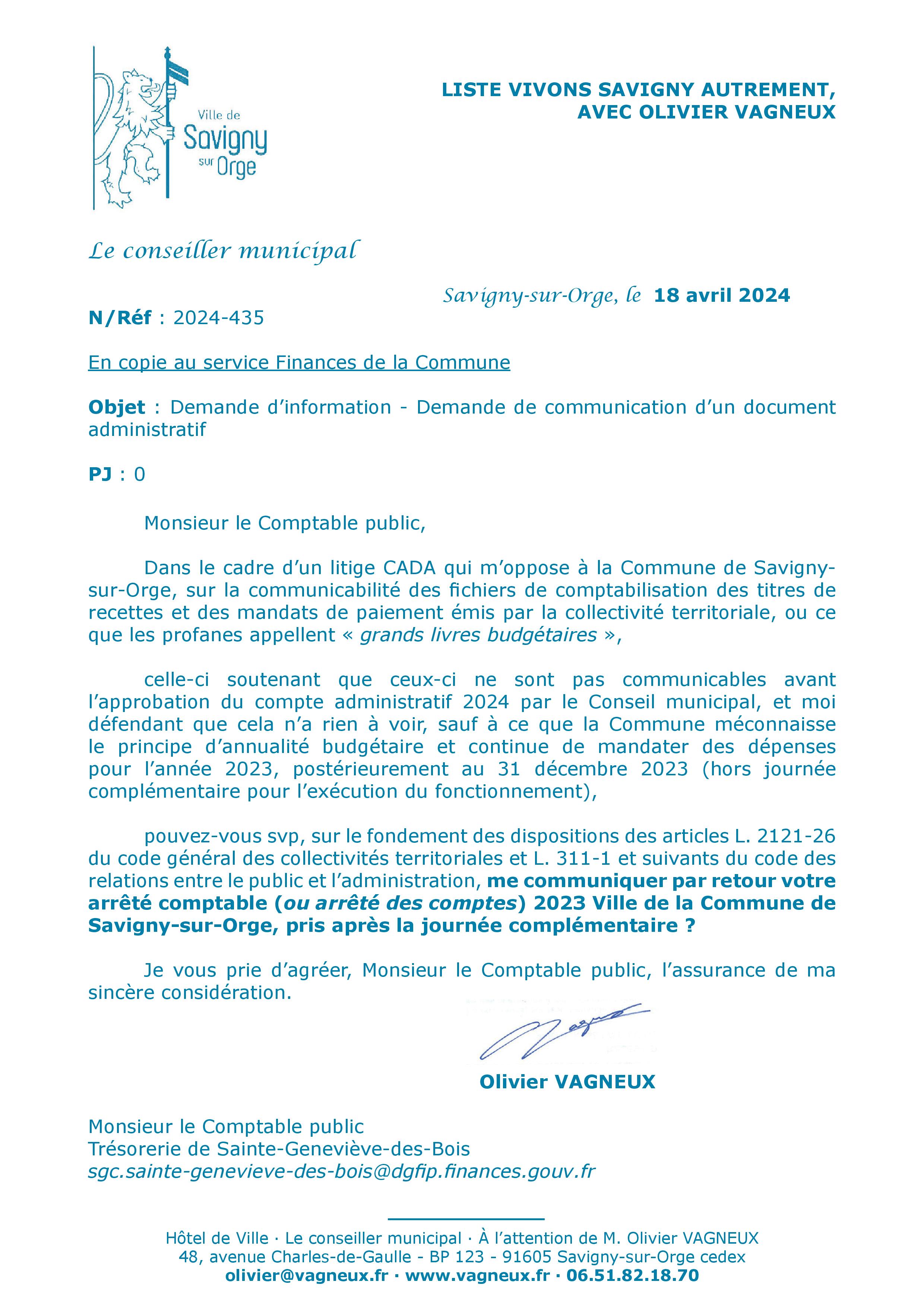 Au cas présent, je demande au comptable public si le compte de gestion 2023 a été signé par lui ; et je lui demande la communication du document administratif qui acte sa signature.