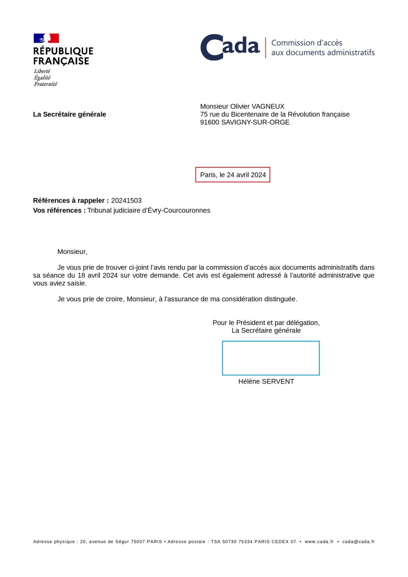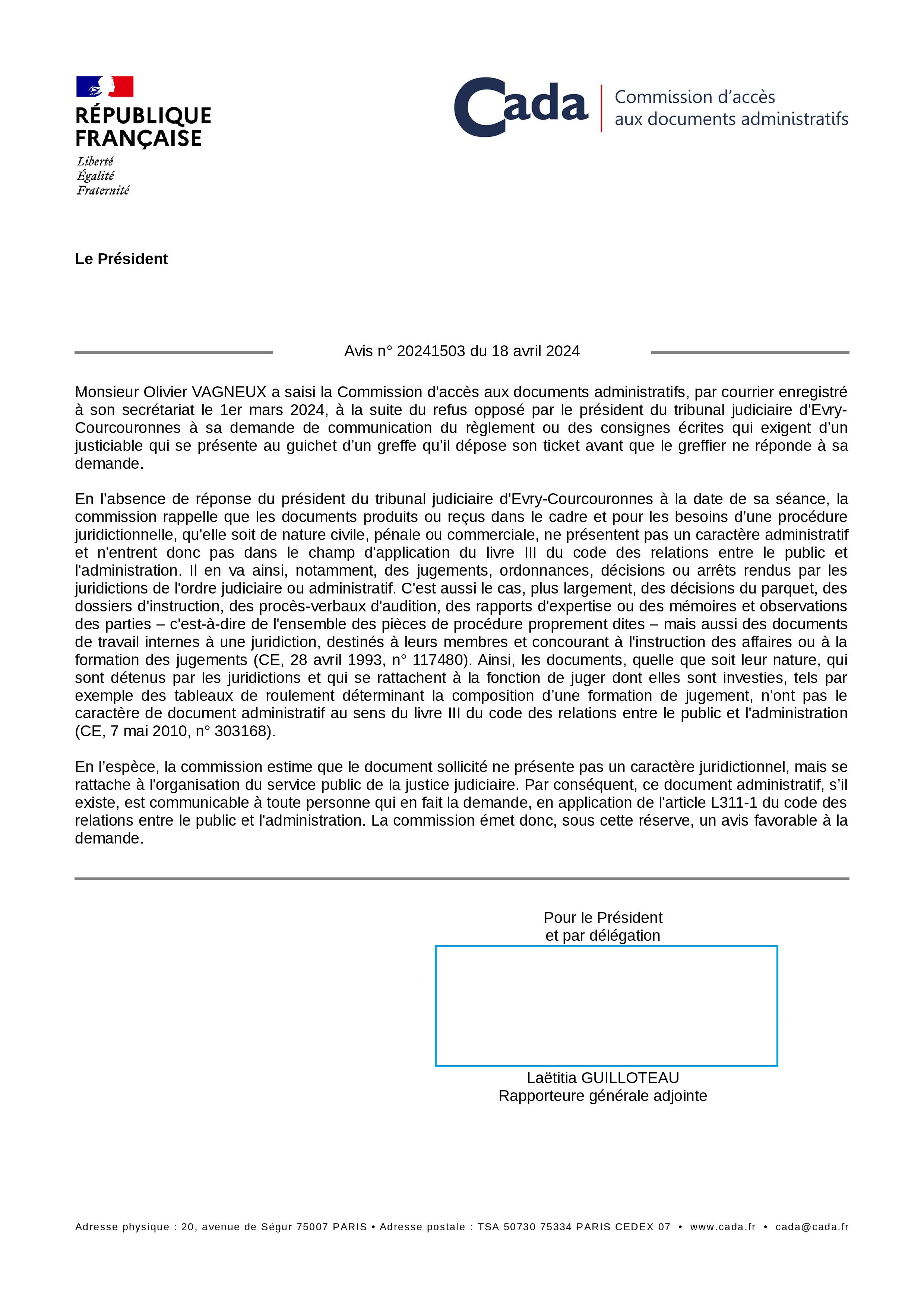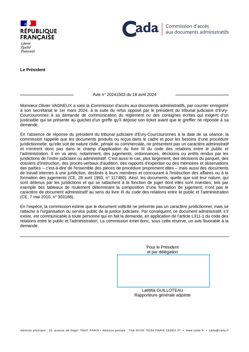 Un avis de la Commission d’accès aux documents administratifs (CADA) qui me confirme que le président du Tribunal judiciaire d’Évry-Courcouronnes, ne sait pas faire la différence entre un document juridictionnel et un document administratif qui concerne l’organisation administrative de la justice ¯\_(ツ)_/¯ Miskine pour lui.