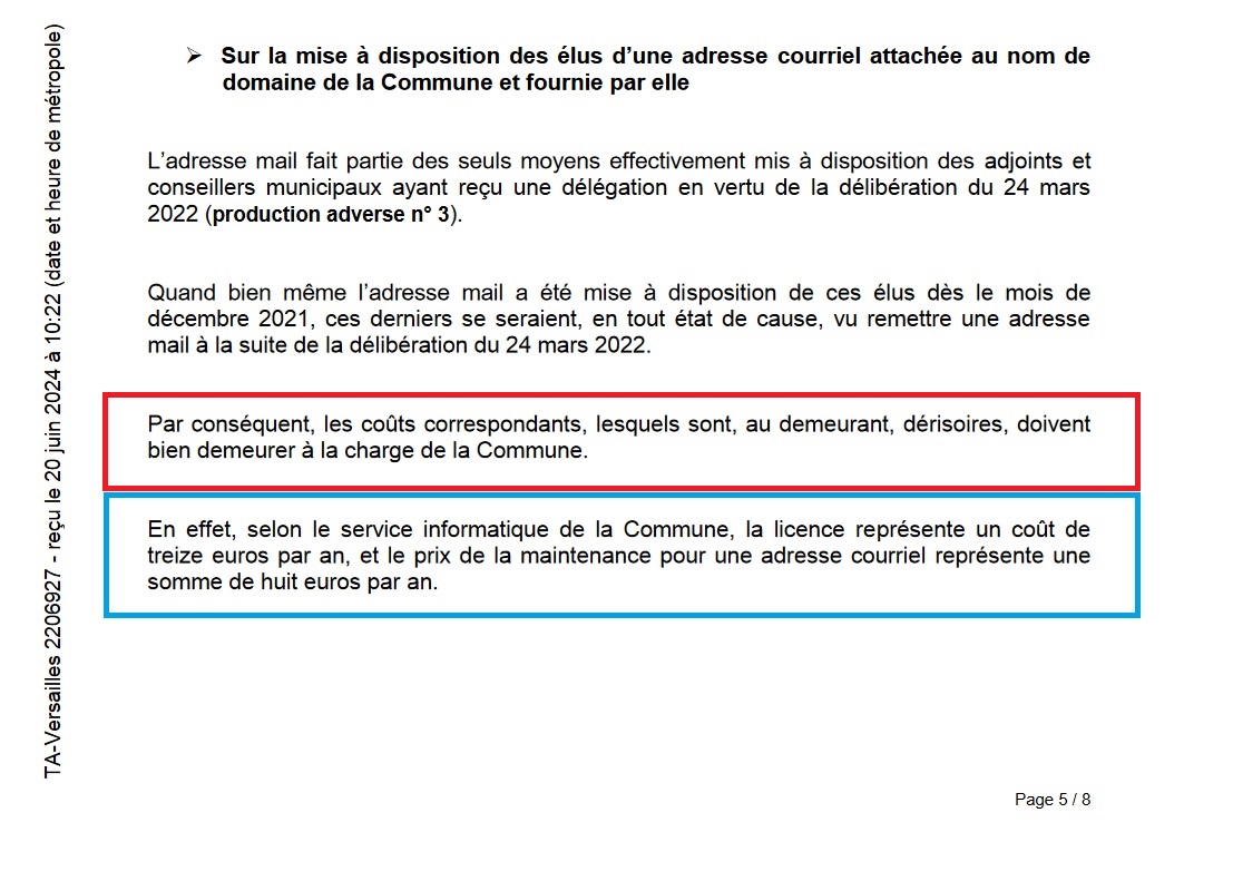 Acte 3 : Je vais au tribunal administratif ; en fait, parce que je demande à TEILLET de rembourser la période pendant laquelle les élus de sa majorité ont eu des adresses courriel, alors qu’ils n’en avaient pas encore le droit (il faut une délibération du Conseil municipal pour pouvoir légalement disposer d’une telle adresse courriel.)