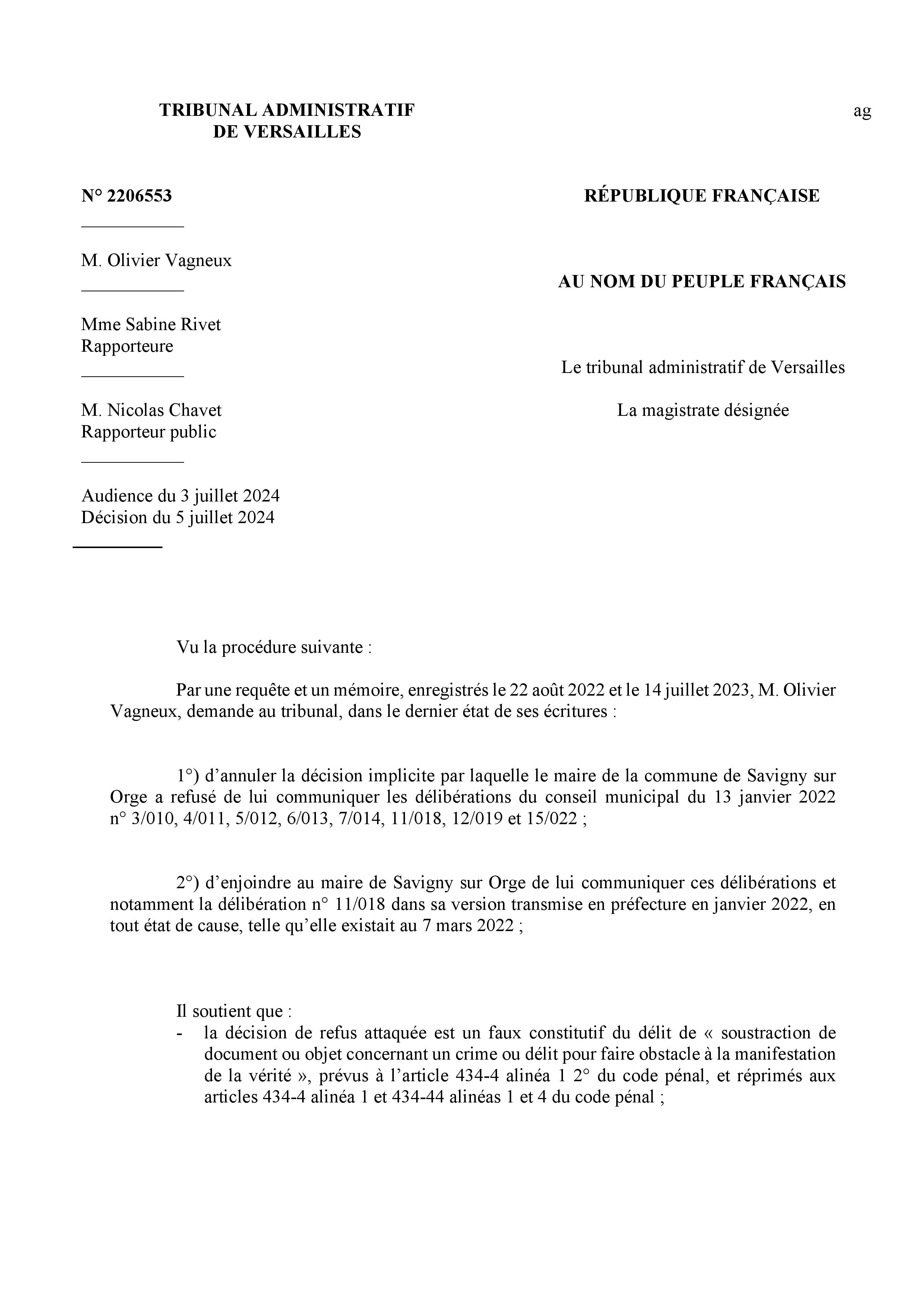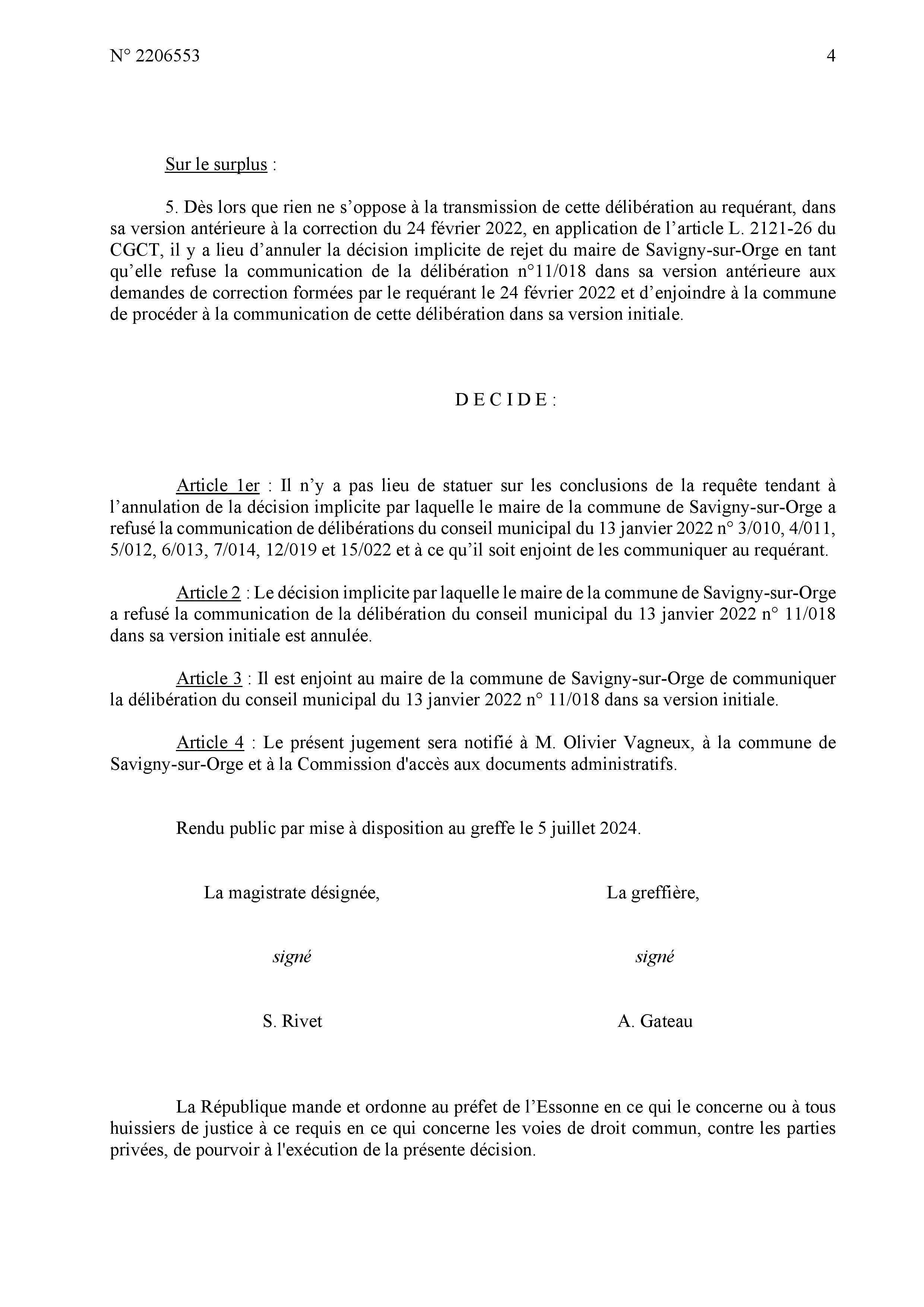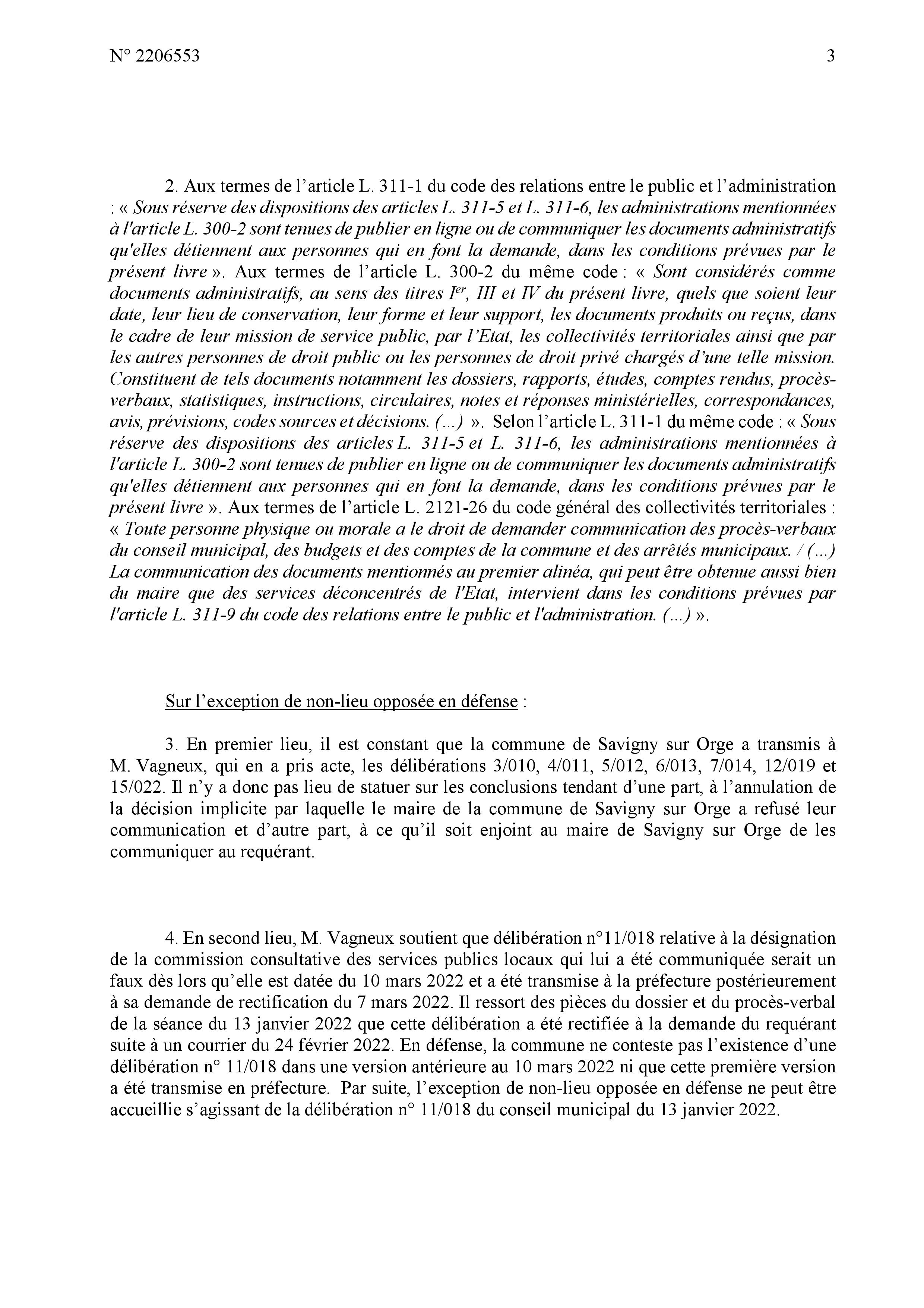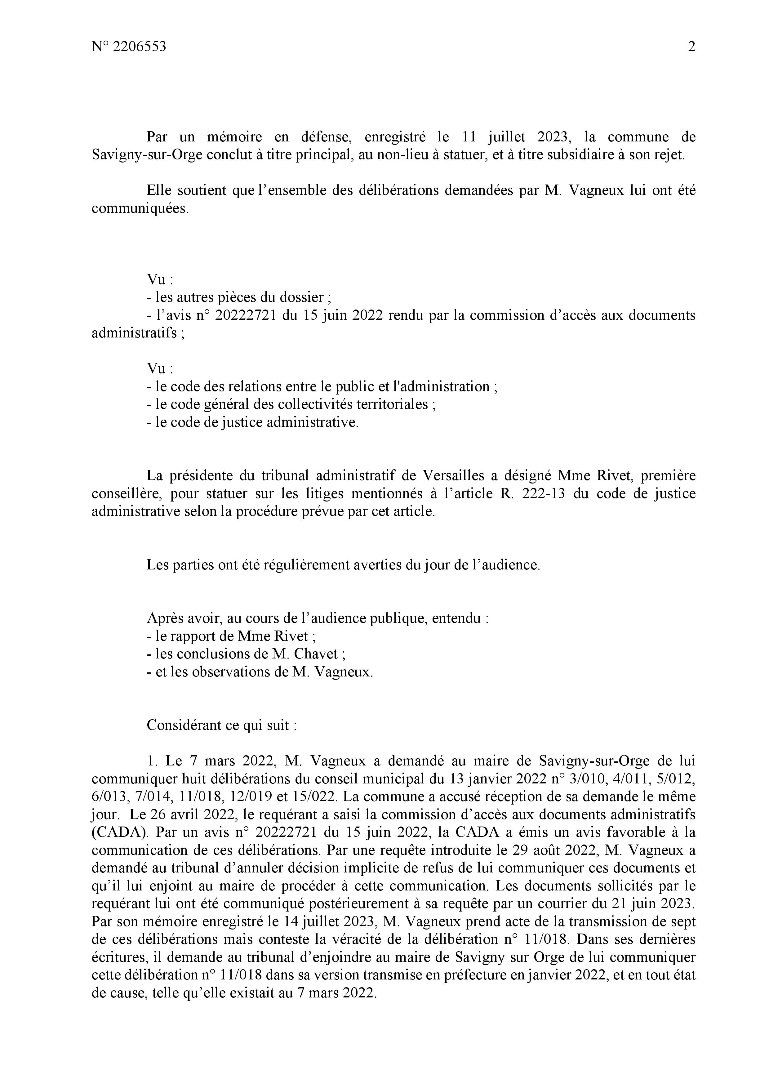 Et ensuite, mais pour votre affaire, je suis pas d’accord avec le rapporteur public parce qu’il n’y a rien dans le dossier qui dit qu’il a existé une première version de la délibération transmise avant le 10 mars 2022 et votre demande de correction, donc je vais prononcer un non-lieu à statuer général.