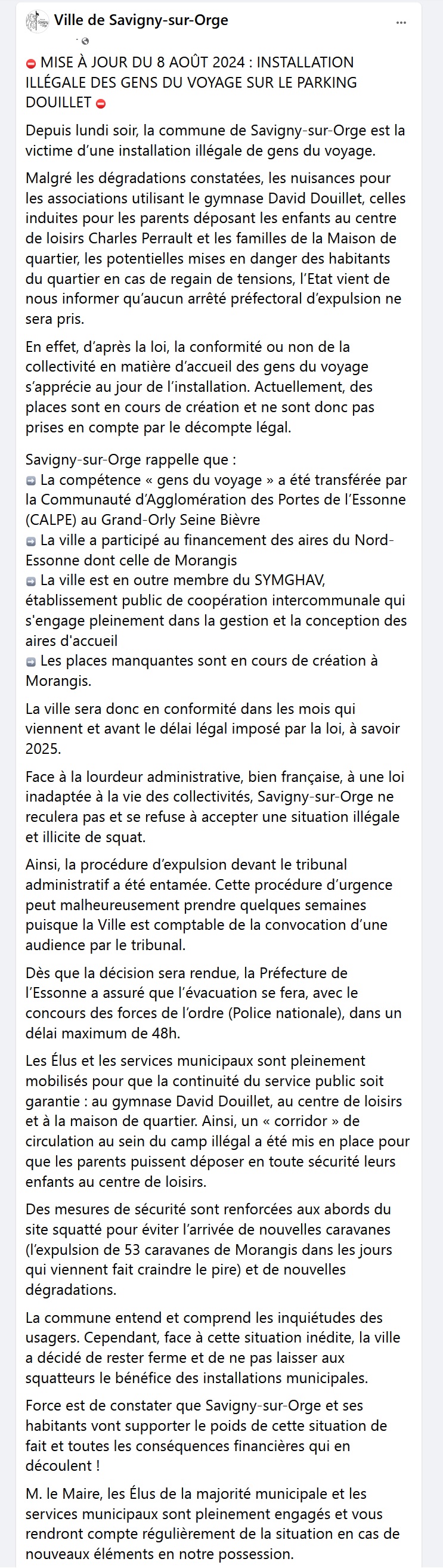 Sur Facebook, on apprend que le maire et les élus de la majorité municipale de Savigny sont pleinement engagés pour obtenir l’évacuation du parking Douillet, illégalement occupé par des gens du voyage.