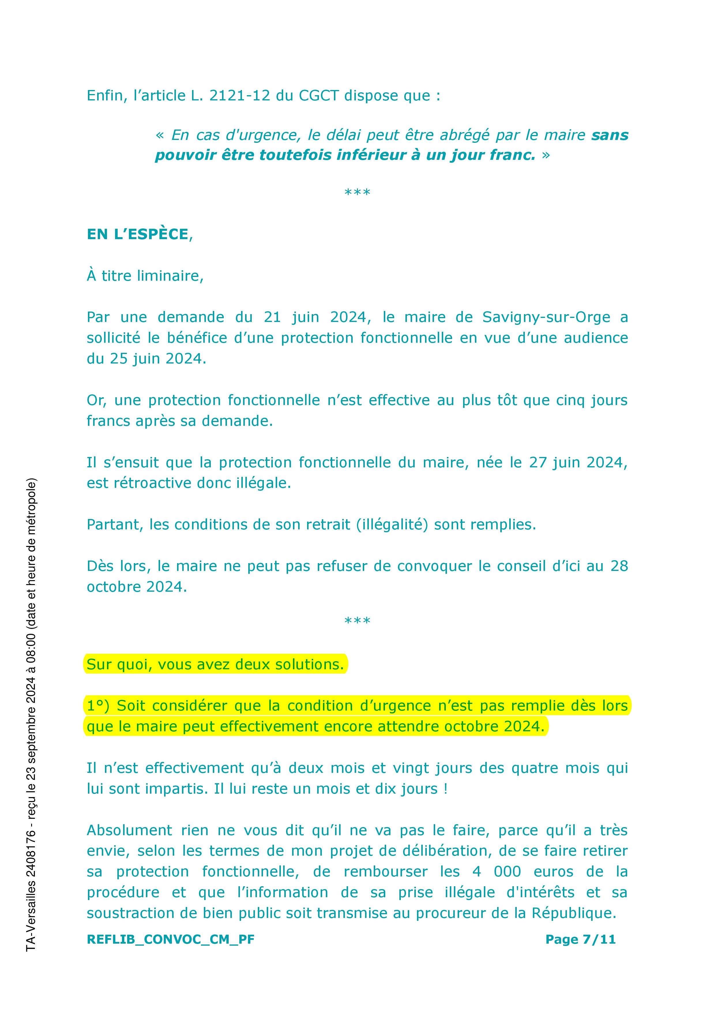 Vous lirez dans mes écritures, reproduites ci-après pour les deux bonnes pages, que je préviens aussi le juge que ce n’est pas parce que le maire n’a rien fait en 2 mois et 20 jours, qu’il ne fera rien le dernier mois et les dix derniers jours restants. Objectivement !