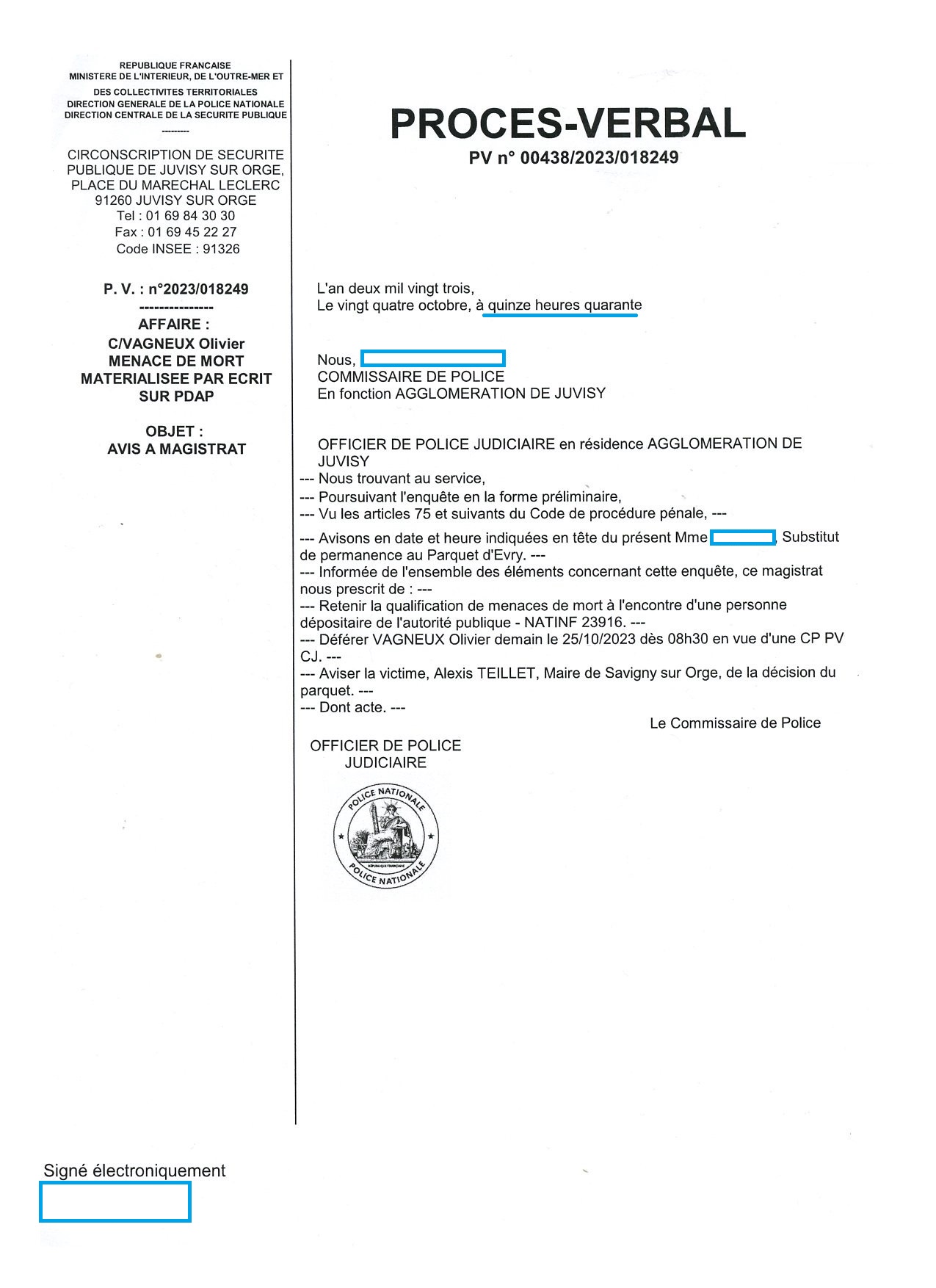 Et le flic a quand même attendu 18 h 10 pour m’informer des suites de ma garde-à-vue alors que TEILLET en a été informé avant, selon le numéro de classement des procès-verbaux, puisque le numéro du PV qui informe TEILLET est antérieur au numéro du PV qui m’informe de mon défèrement…