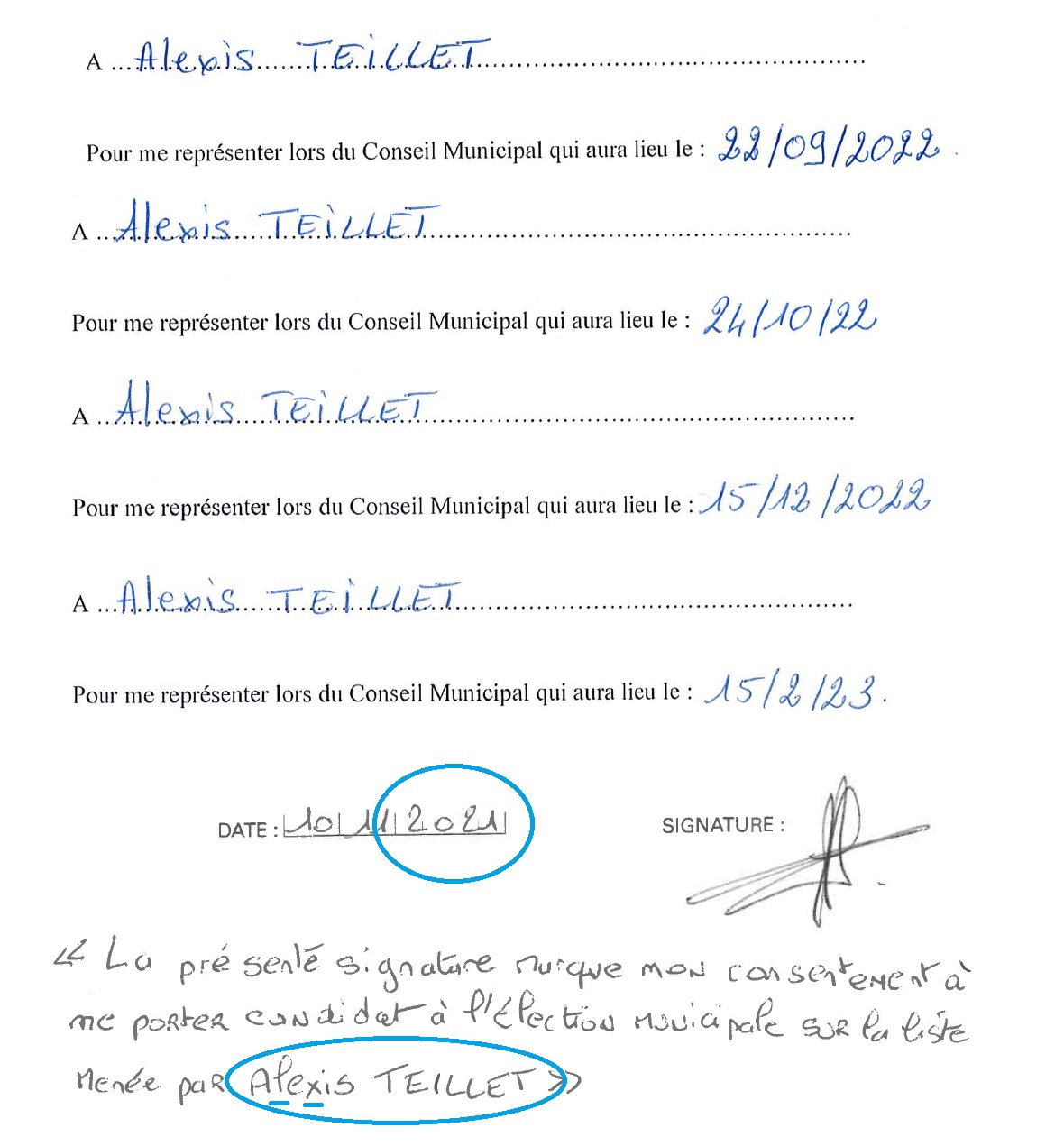 Qui m’ont donné l’idée (pas eux directement) de comparer le formulaire de candidature d’Éric HUIBAN à la municipale de 2021 avec les procurations de HUIBAN éditées en 2022 et 2023.