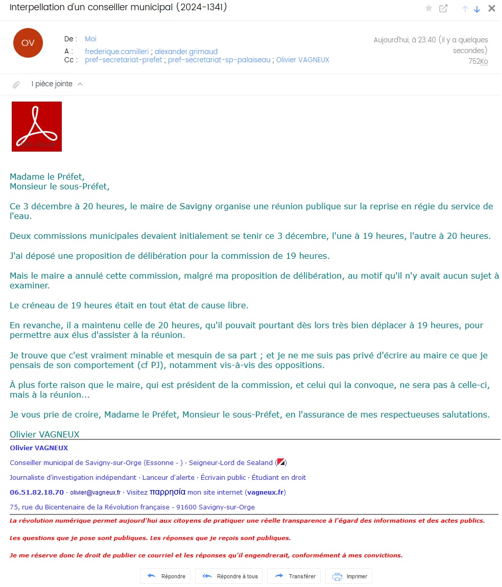 Excusez mon retard mais le maire de Savigny ne trouve rien de plus intelligent que de convoquer les commissions municipales aux heures où il organise des réunions publiques. D’ailleurs, je ne l’y ai pas vu. Ça la fout mal pour le président de la commission qui convoque mais ne vient pas… Avait-il peur de mon intervention sur le fait que Reso qui remplace Suez emploie les services de Suez, mais chut, il ne faut pas le dire ! Ou alors que si on avait adhéré au SEDIF, ce serait encore moins cher pour la population, mais comme ce sont des UDI, les PCF du GOSB n’en veulent pas ! Ou alors que la baisse du prix de l’eau annoncée n’a pas encore été validée… ¯\_(ツ)_/¯