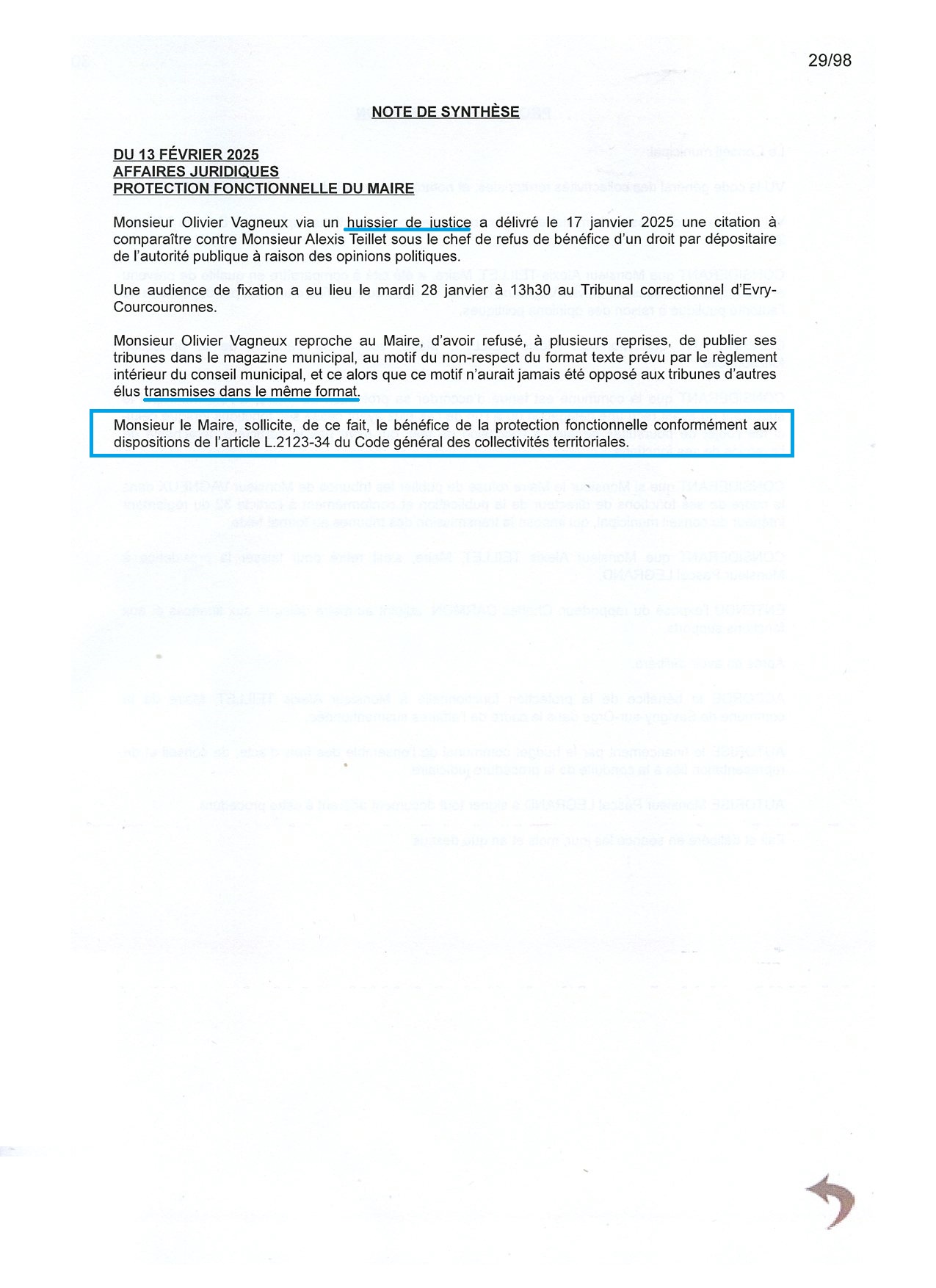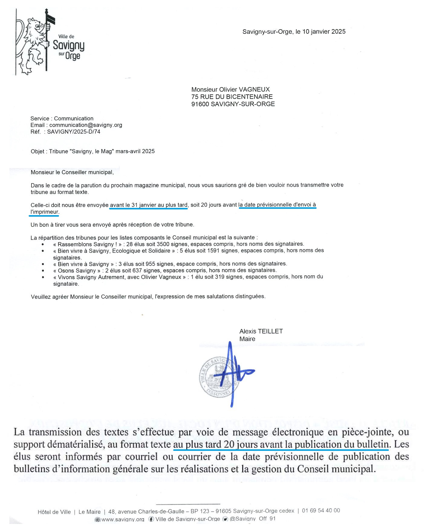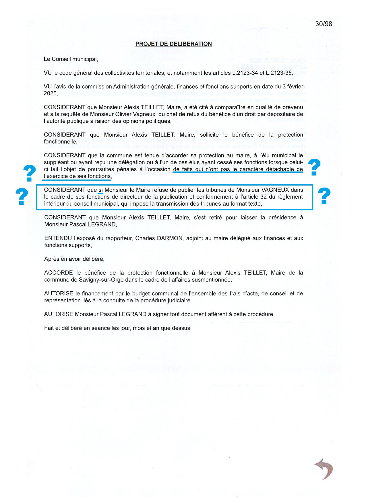 « CONSIDERANT que si Monsieur le Maire refuse de publier les tribunes de Monsieur VAGNEUX dans le cadre de ses fonctions de directeur de la publication et conformément à l’article 32 du règlement intérieur du conseil municipal, qui impose la transmission des tribunes au format texte. »
