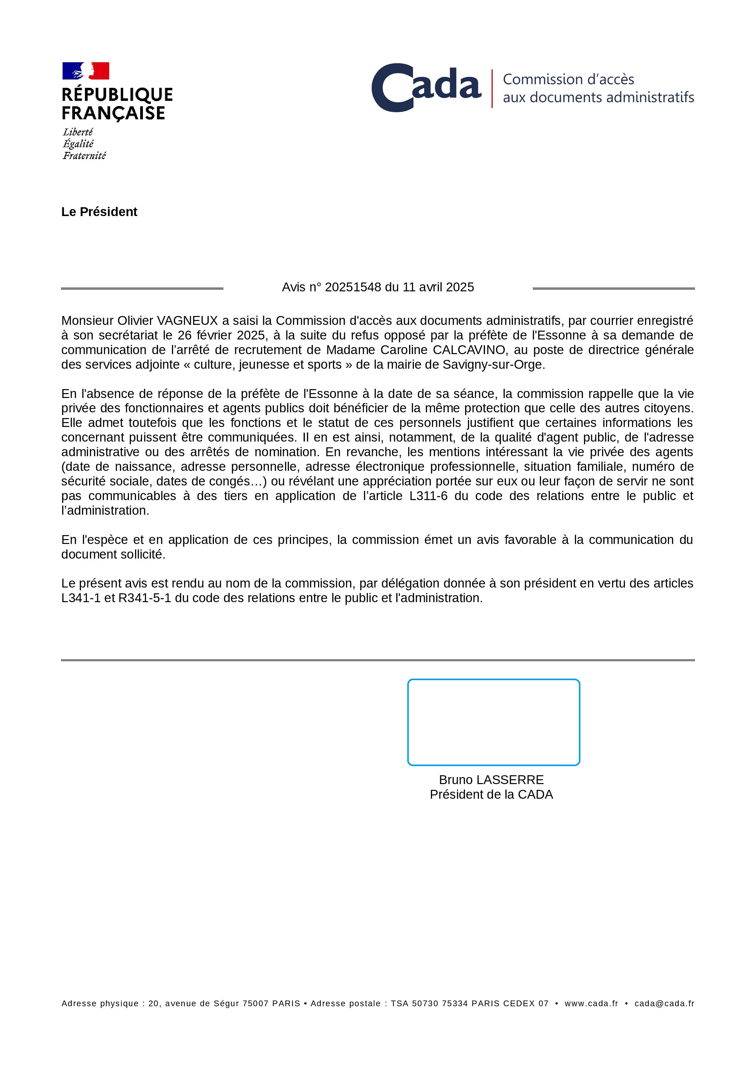 pour transmettre au contrôle de légalité l’arrêté de recrutement de Caroline CALCAVINO, la fille de l’élue de la majorité municipale Anne-Marie GÉRARD, au poste de directrice générale des services adjointe chargée de la culture, de la jeunesse et des sports, créé en décembre 2024 !