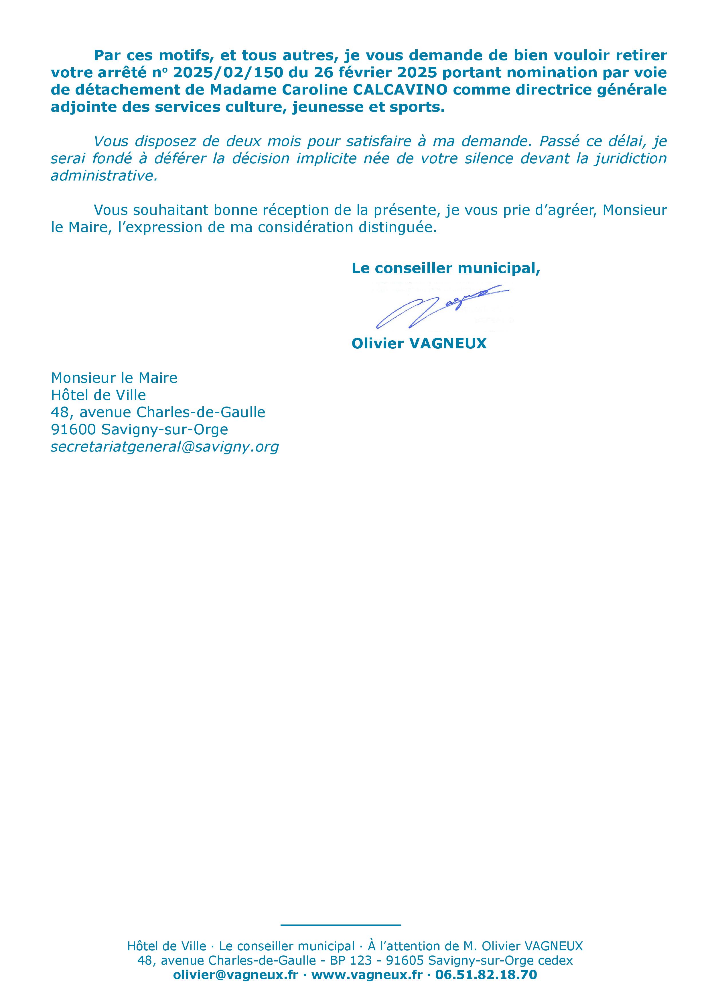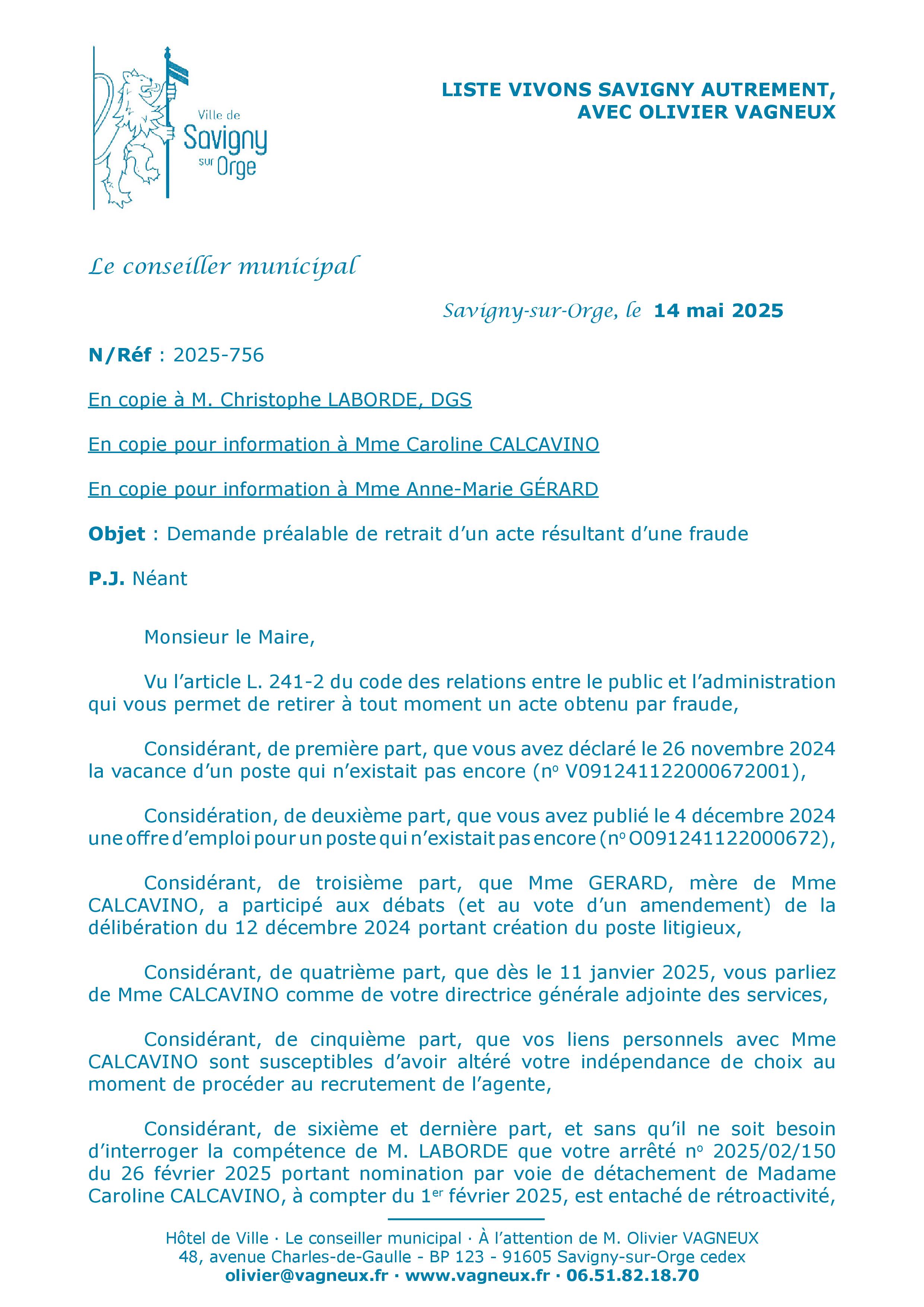 Du coup, Alexis a reçu ce mercredi 14 mai, une demande de retrait de son nouvel arrêté de recrutement de Caroline CALCAVINO, pour me permettre d’agir par voie d’exception, contre la décision du maire refusant de revenir sur son arrêté.