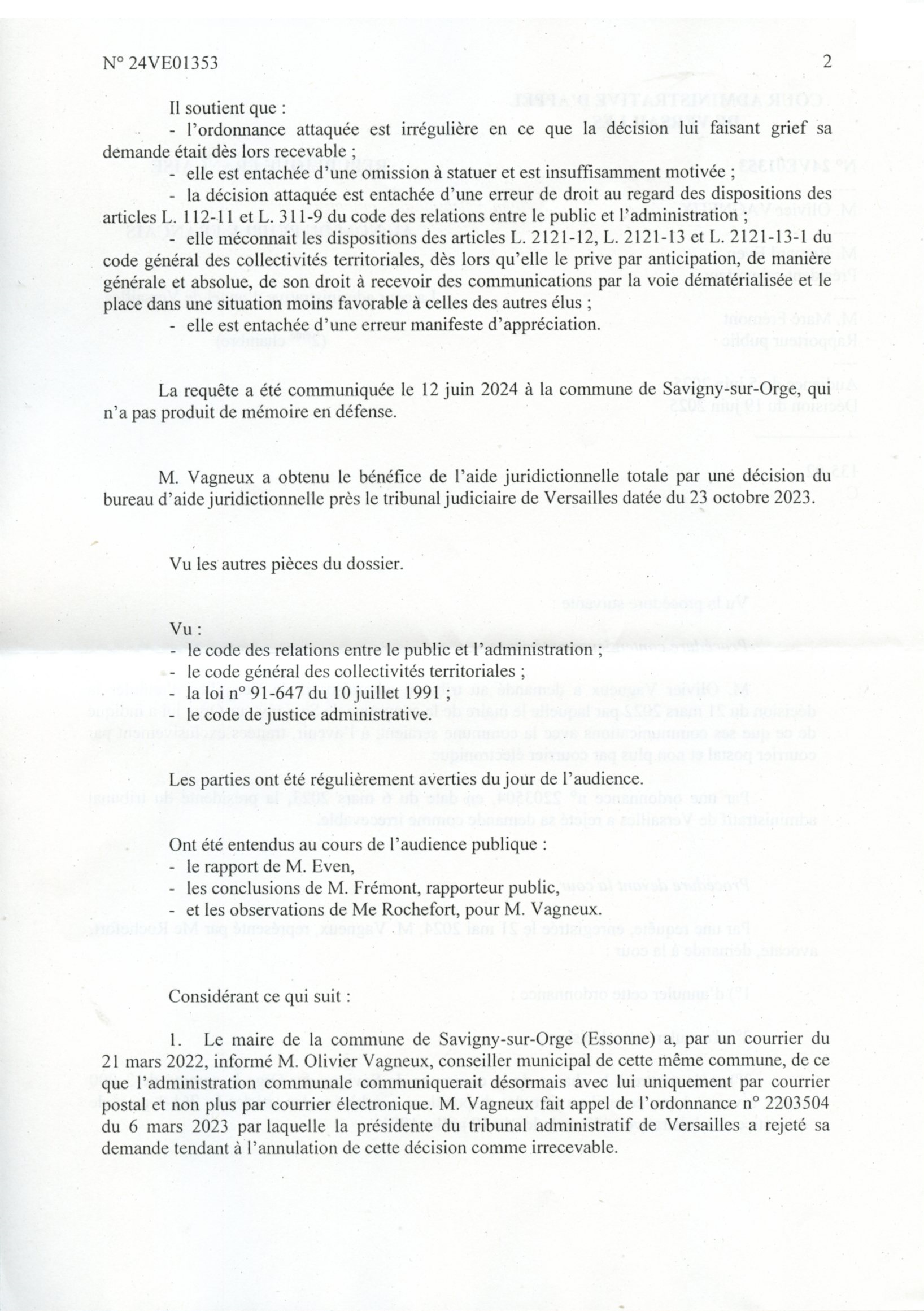 1. Le maire de la commune de Savigny-sur-Orge (Essonne) a, par un courrier du 21 mars 2022, informé M. Olivier Vagneux, conseiller municipal de cette même commune, de ce que l’administration communale communiquerait désormais avec lui uniquement par courrier postal et non plus par courrier électronique. M. Vagneux fait appel de l’ordonnance n° 2203504 du 6 mars 2023 par laquelle la présidente du tribunal administratif de Versailles a rejeté sa demande tendant à l’annulation de cette décision comme irrecevable.