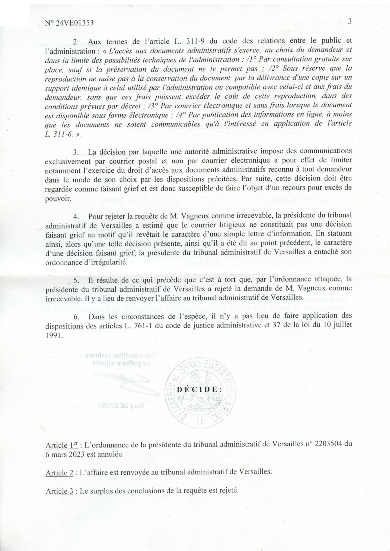 Il m’arrange de lire dans cet arrêt qu’Alexis TEILLET n’a pas le droit de ne communiquer avec moi exclusivement que par voie postale, mais nous verrons ce qu’en décide le Tribunal administratif après renvoi.