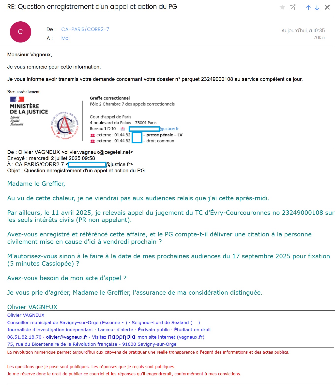 Et la greffière du service de l’audiencement qui écrit à l’avocate générale : un « courriel avocat qui questionne le parquet général ».