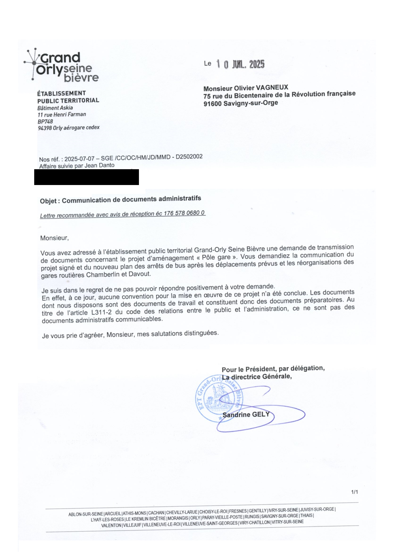 • Olivier VAGNEUX a déposé un recours gracieux contre le Plan local d’urbanisme intercommunal de l’Établissement public territorial du Grand-Orly Seine Bièvre