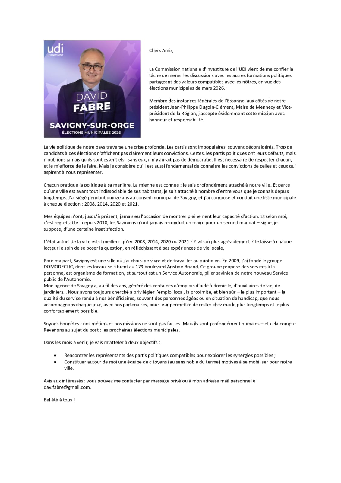 David FABRE, officiellement candidat aux municipales 2026 de Savigny-sur-Orge