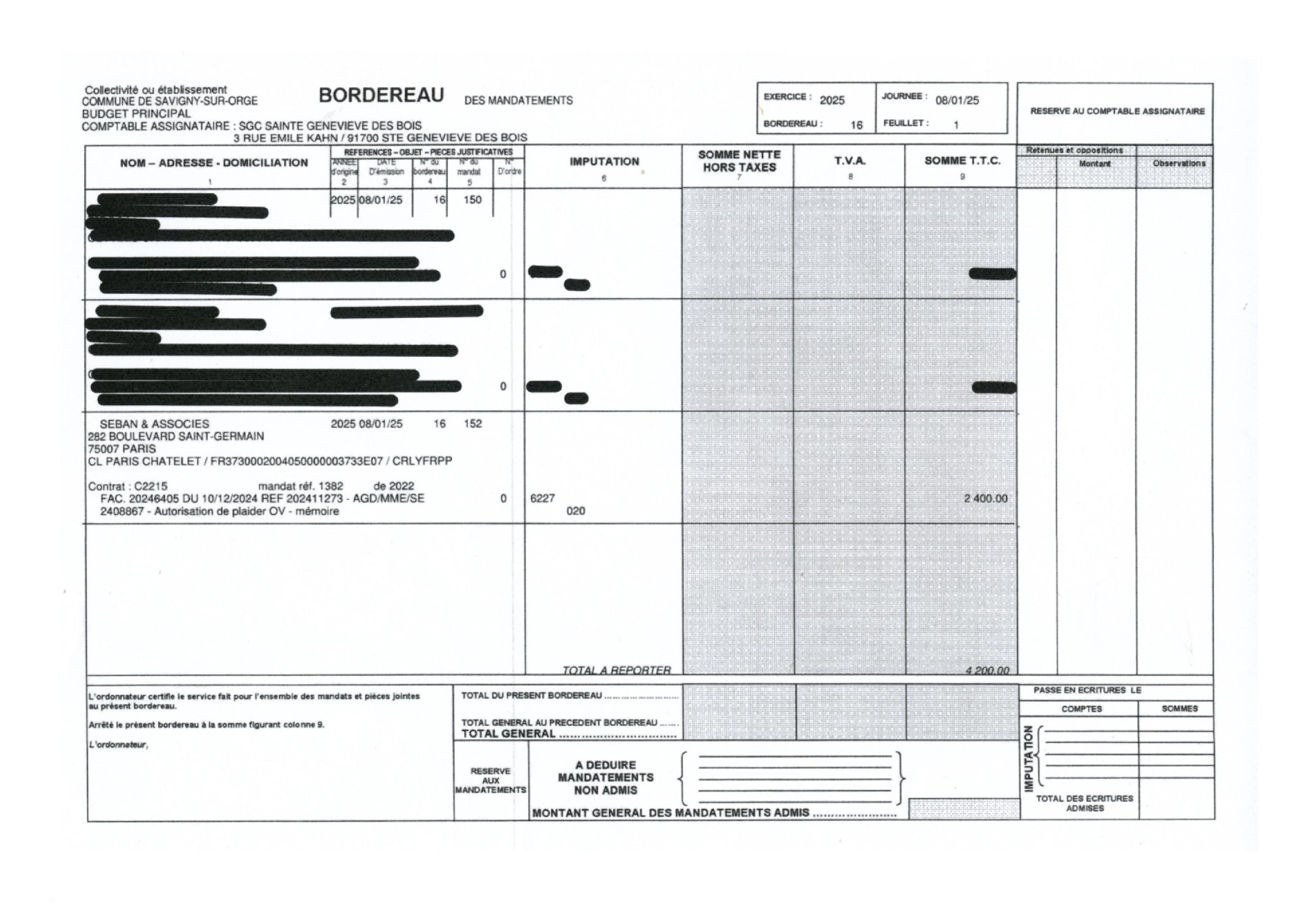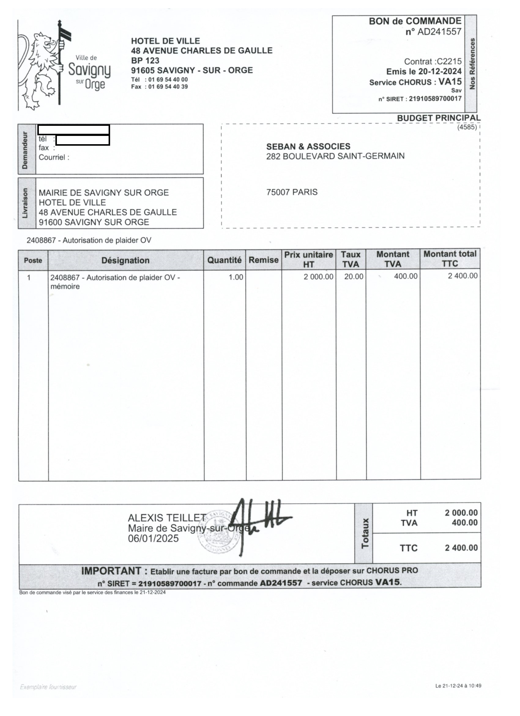 Le 10 décembre 2024, la Commune recevait une facture pour une prestation de rédaction de mémoire en défense dans une demande d’autorisation de plaider au nom de la commune (dossier no 2408867).