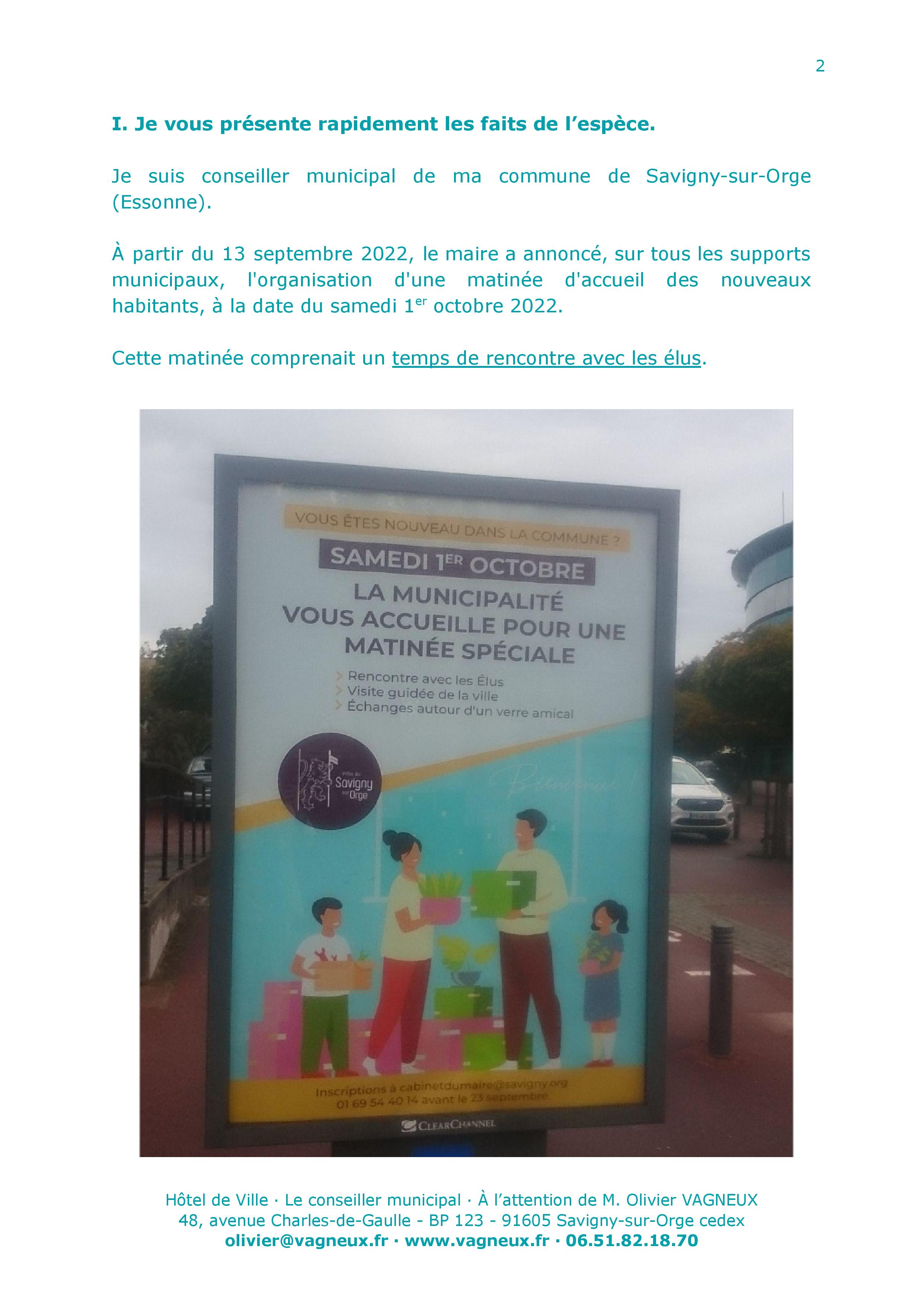 On rappellera que le 1er octobre 2022, TEILLET a organisé une matinée d’accueil des nouveaux habitants, comportant une présentation des projets de la Ville et une rencontre avec les élus ; et qu’il m’en a interdit l’accès.