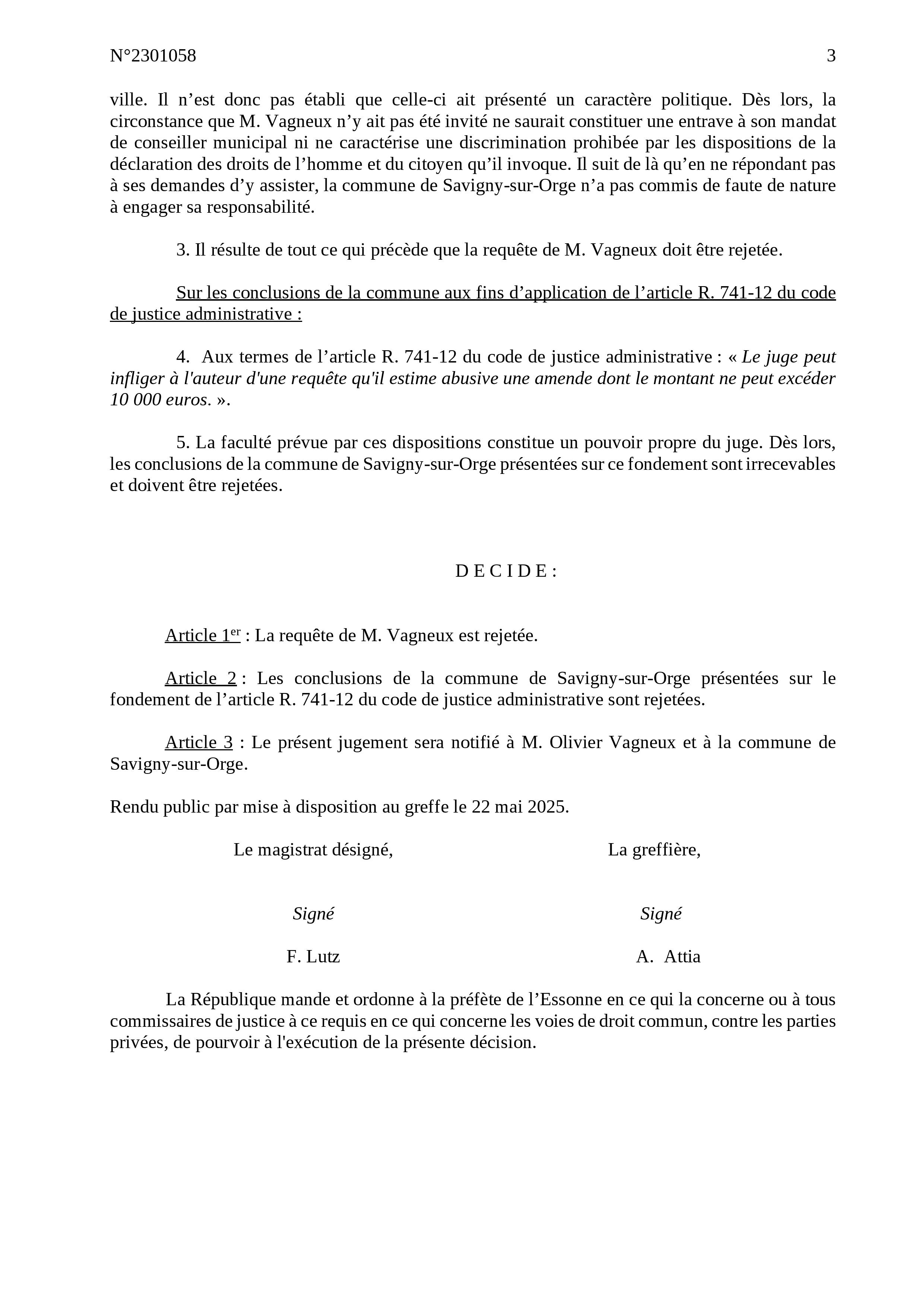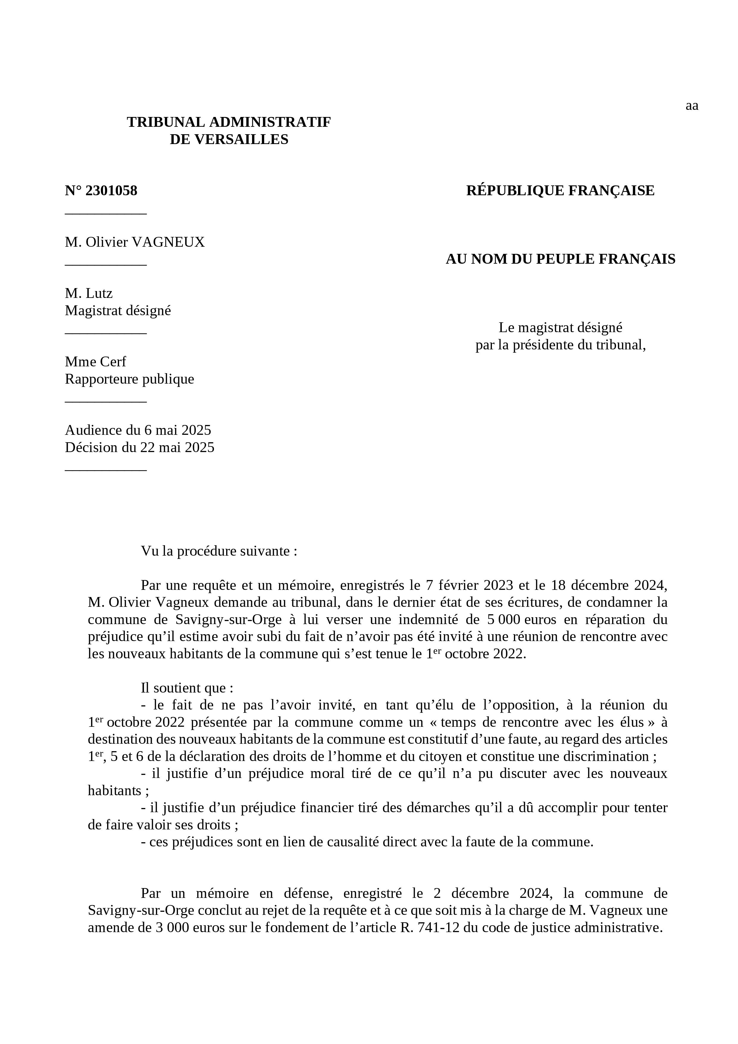Le Tribunal administratif de Versailles a d’abord jugé qu’il n’avait pas commis de faute dans le fait de ne pas m’avoir invité et de n’y avoir invité que les élus de sa majorité.