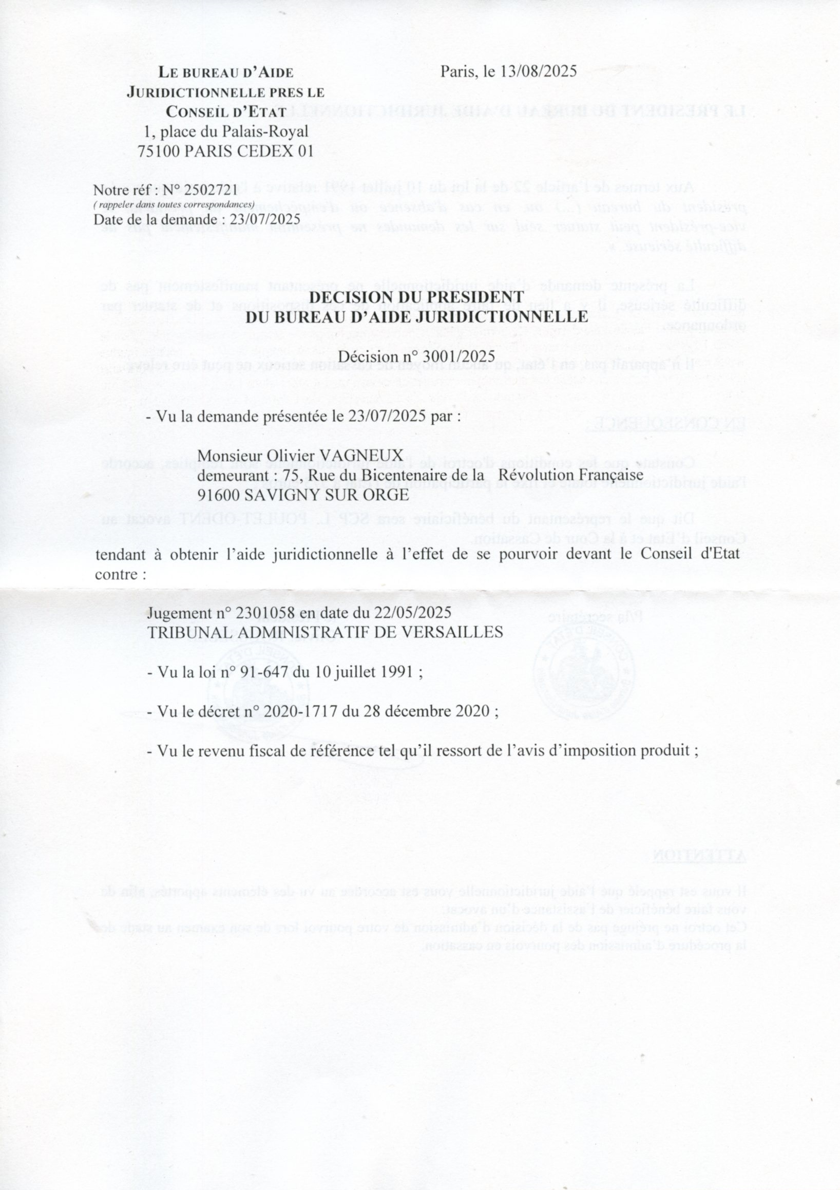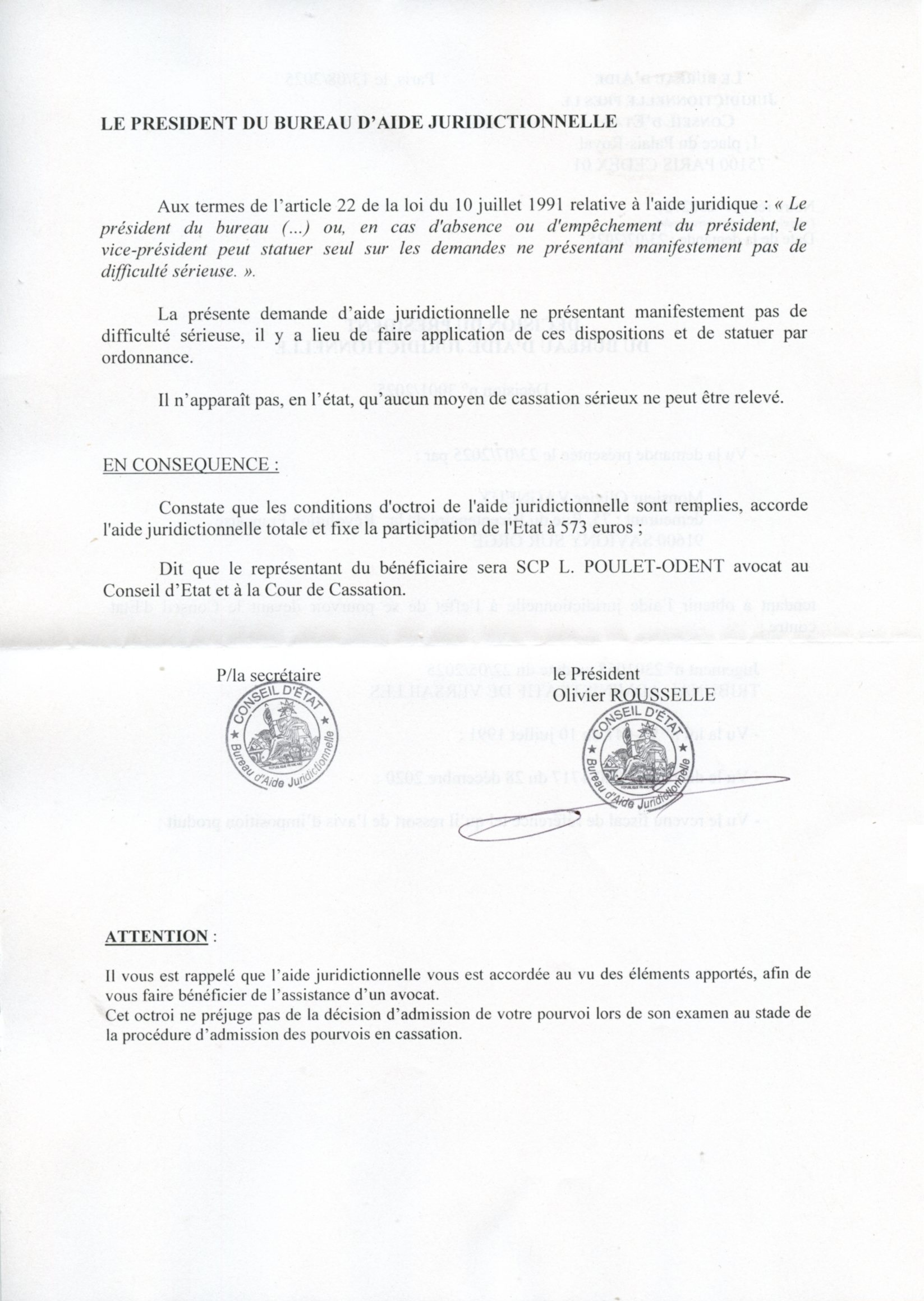 puisque je viens d’obtenir l’aide juridictionnelle en vue de me pourvoir en cassation de ce jugement au motif que : « Il n’apparaît pas, en l’état, qu’aucun moyen de cassation sérieux ne peut être relevé. »