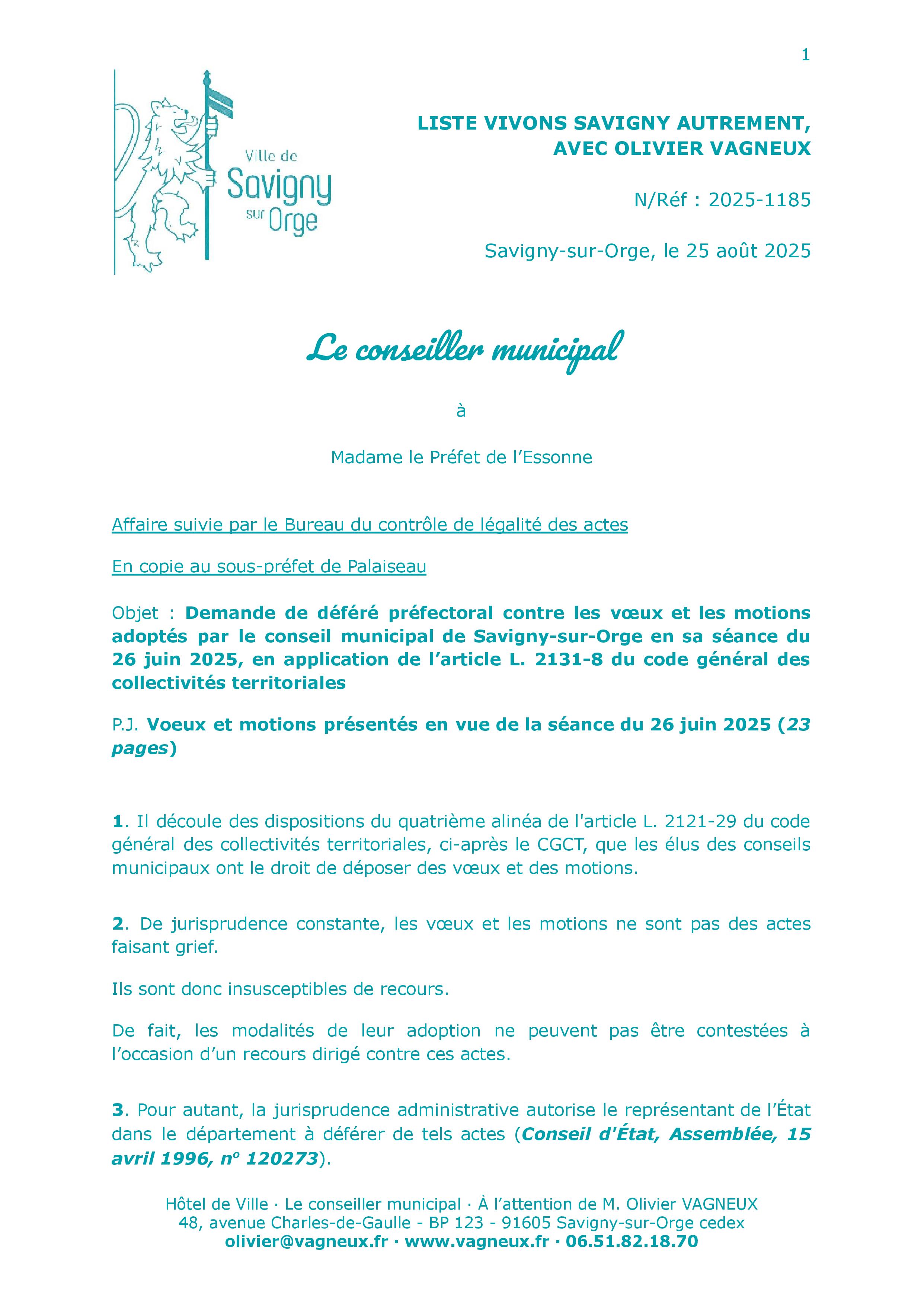 10. Par ces motifs, je vous saisis donc, sur le fondement des dispositions de l’article L. 2131-8 du CGCT, d’une demande de déféré préfectoral des 22 vœux et motions adoptés par le conseil municipal de Savigny-sur-Orge en sa séance du 26 juin 2025, au motif du vice propre tiré de l’irrégularité de leur procédure d’adoption.