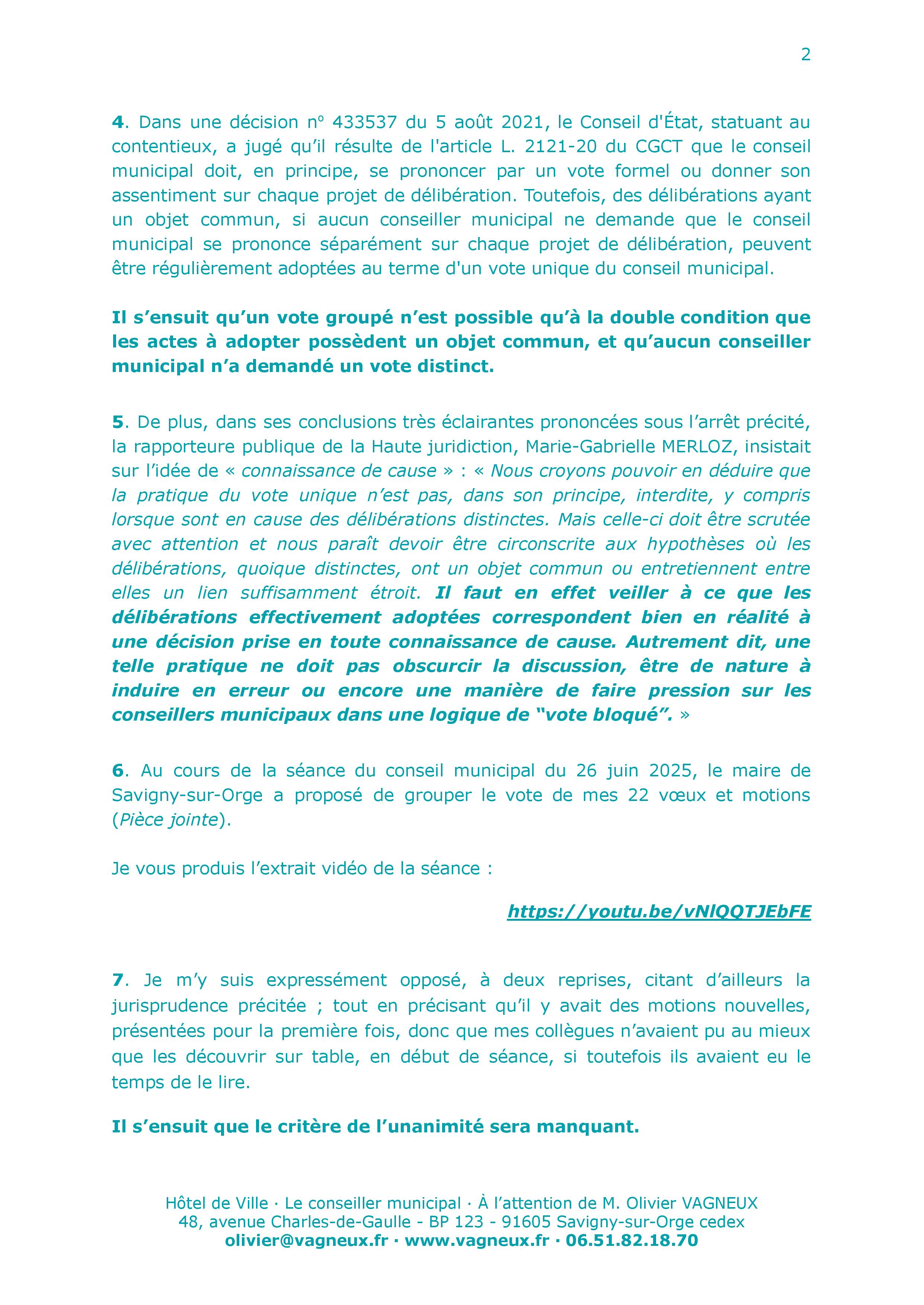 6. Au cours de la séance du conseil municipal du 26 juin 2025, le maire de Savigny-sur-Orge a proposé de grouper le vote de mes 22 vœux et motions (Pièce jointe).