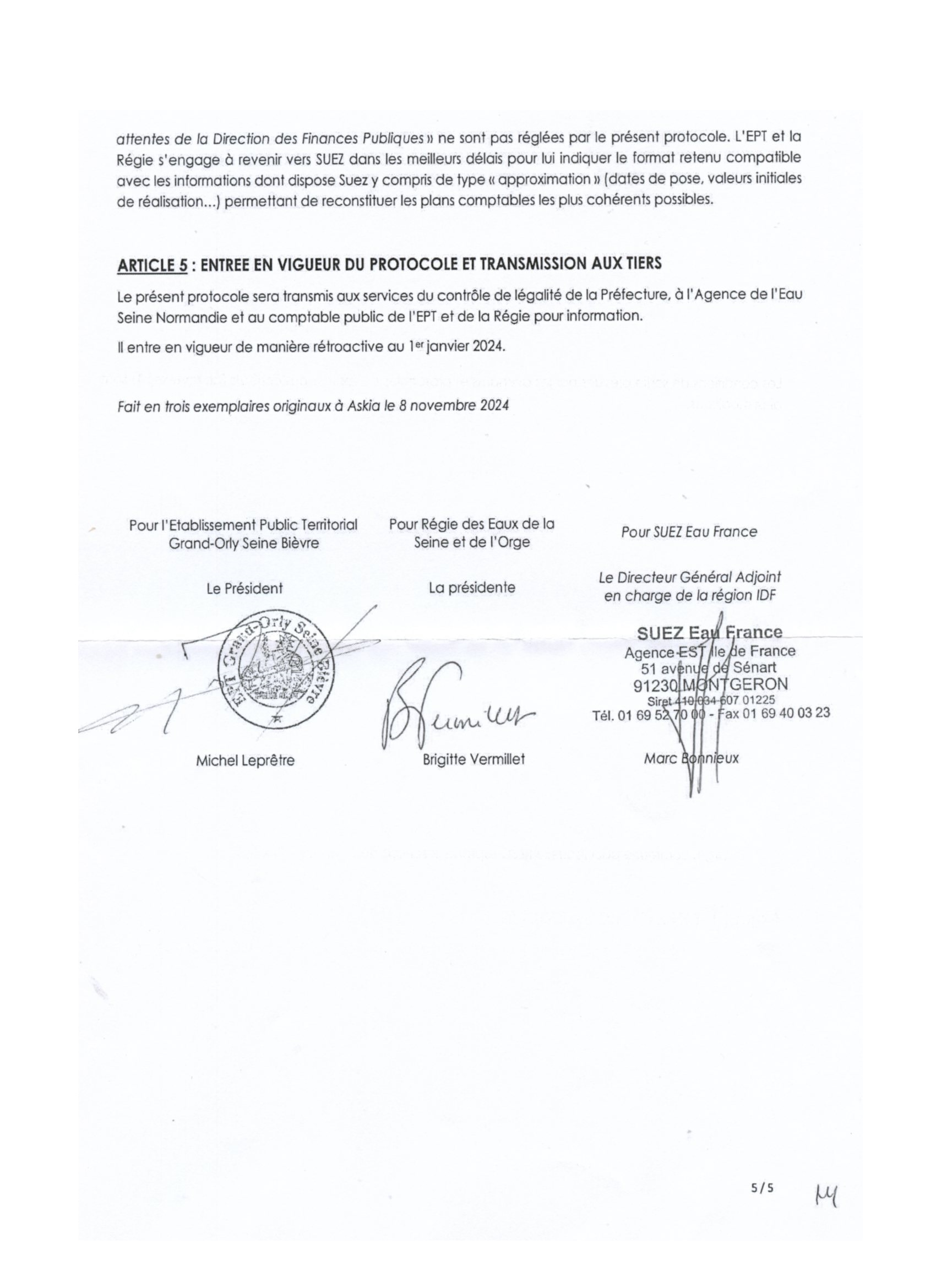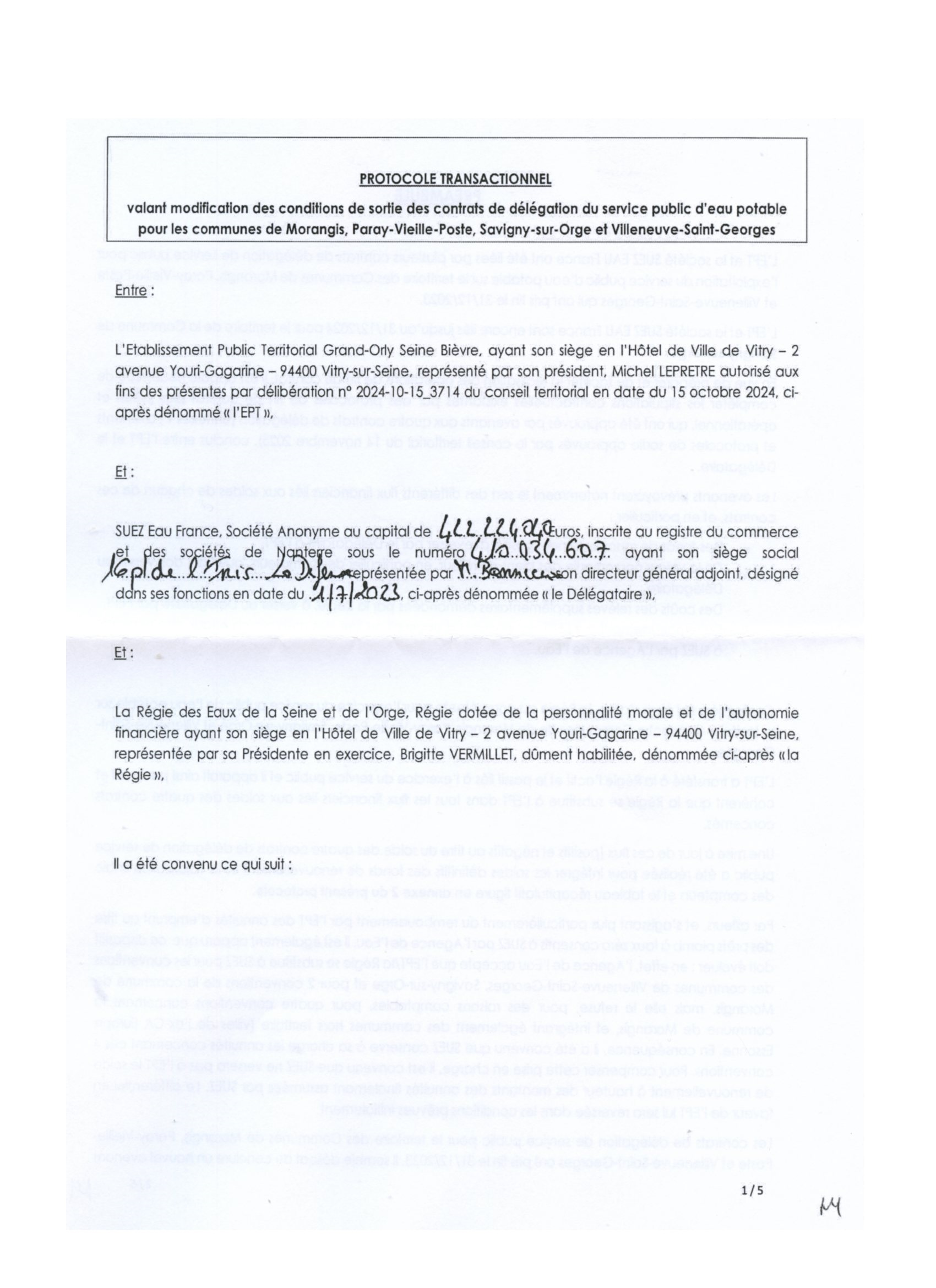 Ni rasoir, ni menace de mort, ni vivisection, mais encore un recours contentieux, pour contraindre Michel LEPRÊTRE à communiquer le protocole transactionnel réglant les conditions de sortie de Morangis, Paray, Savigny et Villeneuve-saint-Georges de la concession de Suez (même s’il manque les annexes).