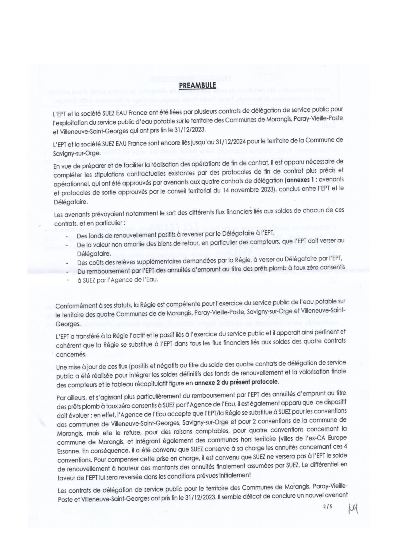 Article 2. On lit que l’Agence de l’eau a refusé de se substituer à l’EPT pour rembourser les annuités d’emprunts consentis à Suez.