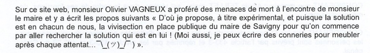 Mais avec toute la délicatesse qu’on leur connaît, ils ont affirmé bien lourdement, et à quatre reprises sur la période de la prévention (dont trois pour TEILLET), que j’avais proféré des menaces de mort.
