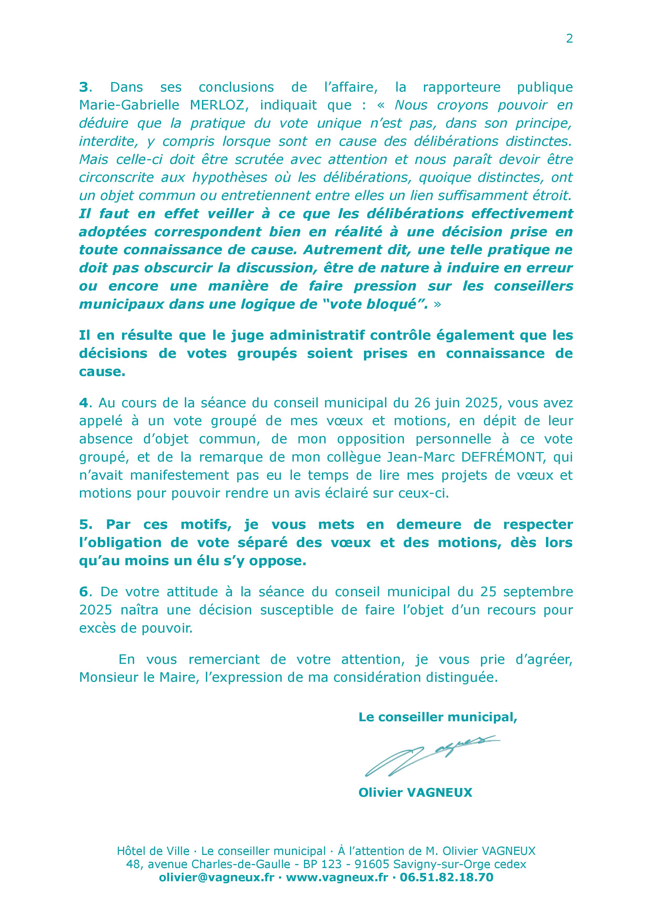 Je fais suite à ma demande préalable no 2025-1190 du 25 août 2025 vous enjoignant de respecter l’obligation de votes séparés pour l’adoption des vœux et des motions dès lors qu’au moins un élu s’y oppose.
