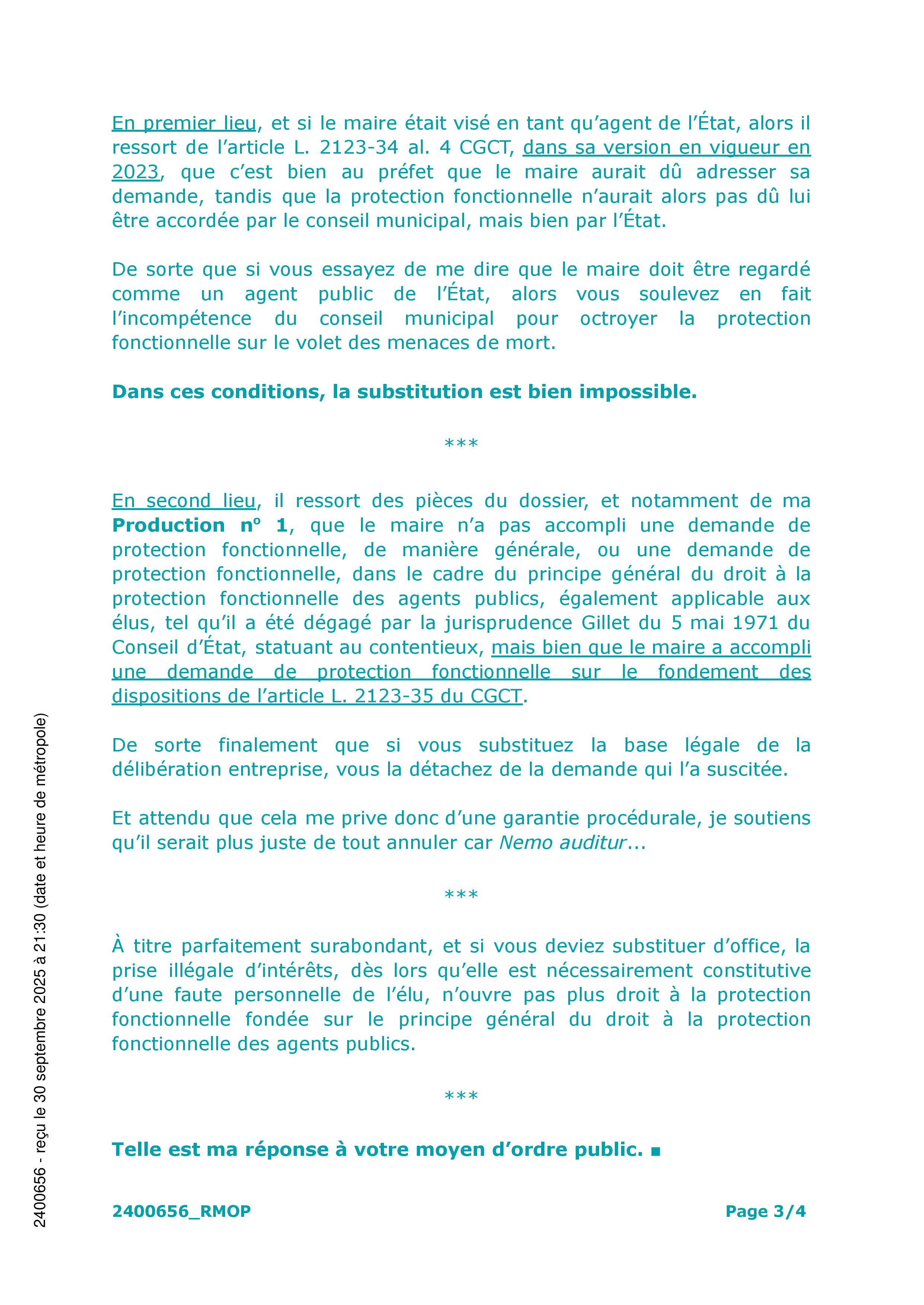 Et moi, je dis bah non, c’était L. 2123-34 CGCT pour le fondement de la seconde protection fonctionnelle, donc vous m’invalidez cela svp.