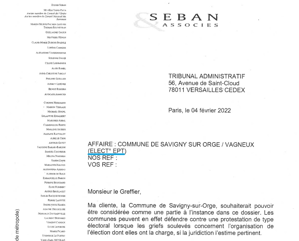 Et j’obtiens la lettre de constitution d’avocat de SEBAN dans une des deux affaires (Élection EPT = 2200393) !