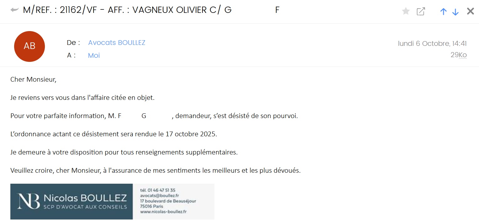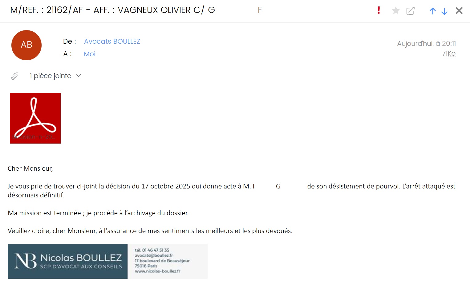 Il était 20 heures 11, ce lundi 20 octobre 2025, quand mon avocat aux Conseils m’a transmis l’ordonnance de la Cour de cassation constatant le désistement. Par hasard, je me trouvais connecté pile à ce moment.