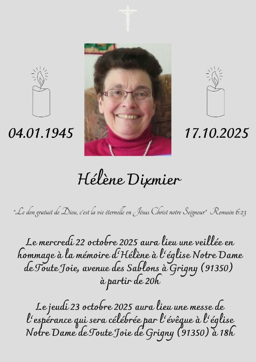 Une messe de l’espérance sera célébrée ce jeudi 23 octobre 2025 à 18 heures 00 en l’église Notre-Dame de toute joie de Grigny.