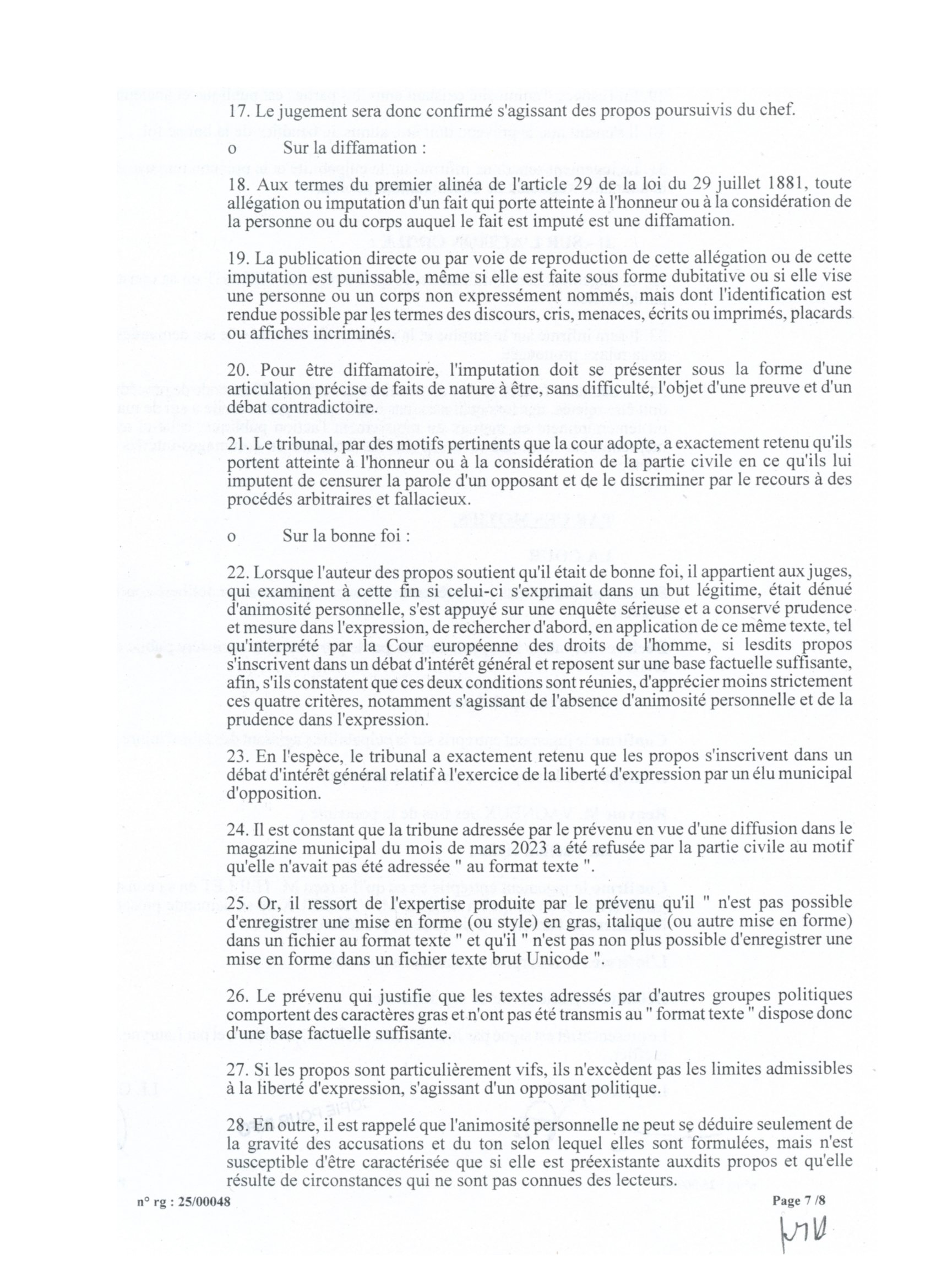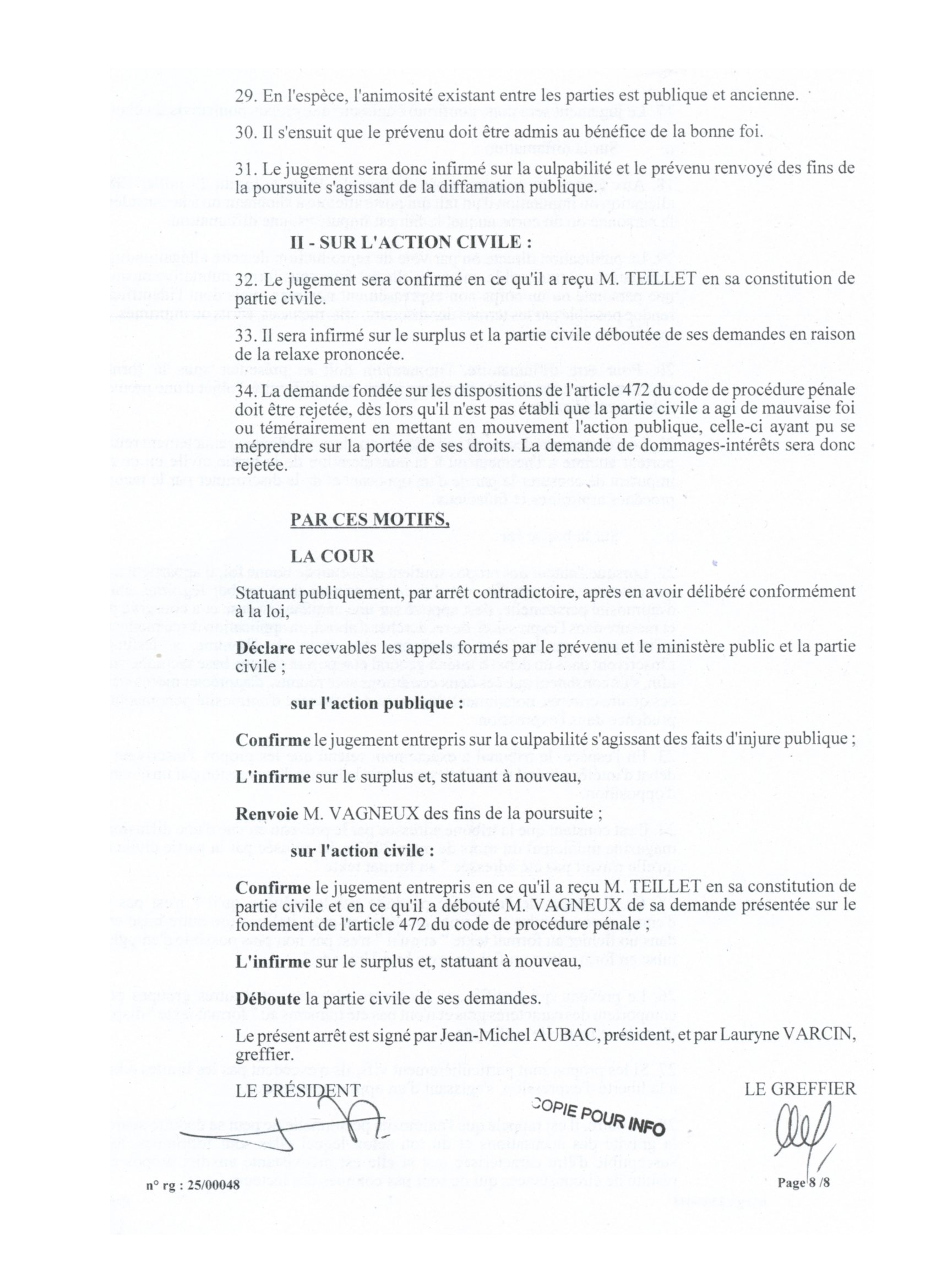Or, jusqu’à l’intervention d’un arrêt de la Cour de cassation, c’est l’arrêt de la Cour d’appel qui fera foi et qui dit qu’il n’était pas insultant de traiter TEILLET d’infâme gros porc dégueulasse et qu’il n’est pas diffamant de dire que TEILLET est un fasciste parce qu’il me censure dans le magazine municipal.