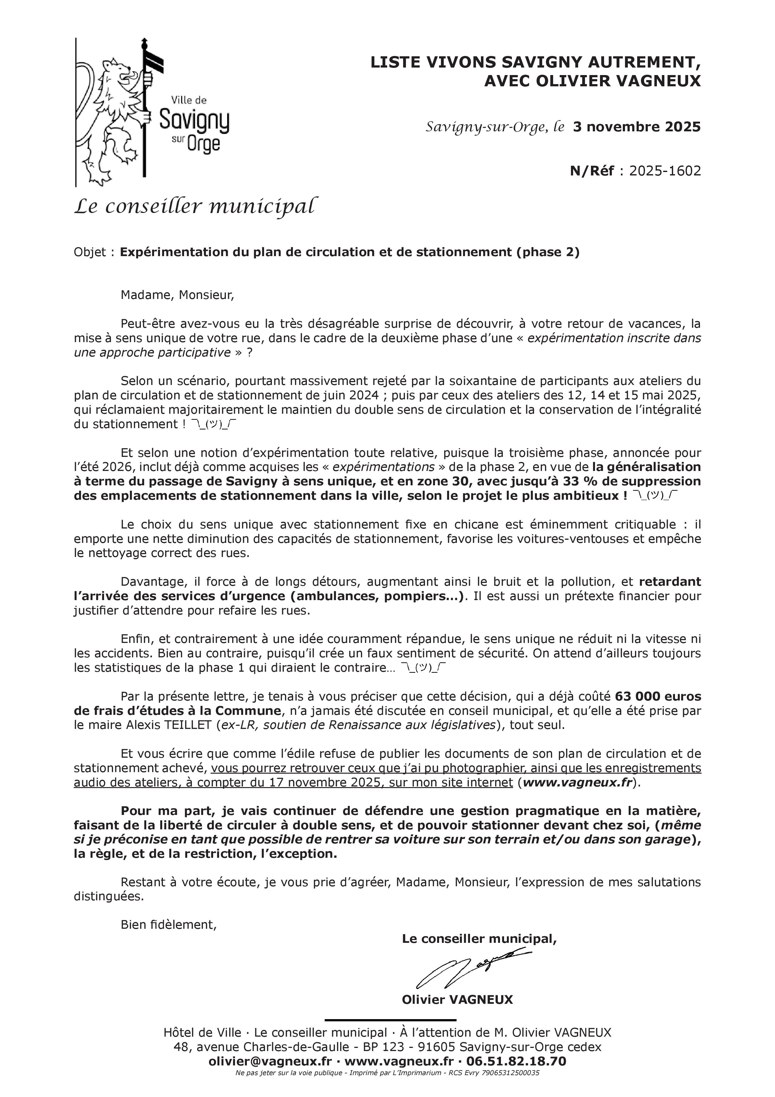 Phase 2 du plan de circulation et de stationnement de Savigny-sur-Orge : mon courrier aux riverains !