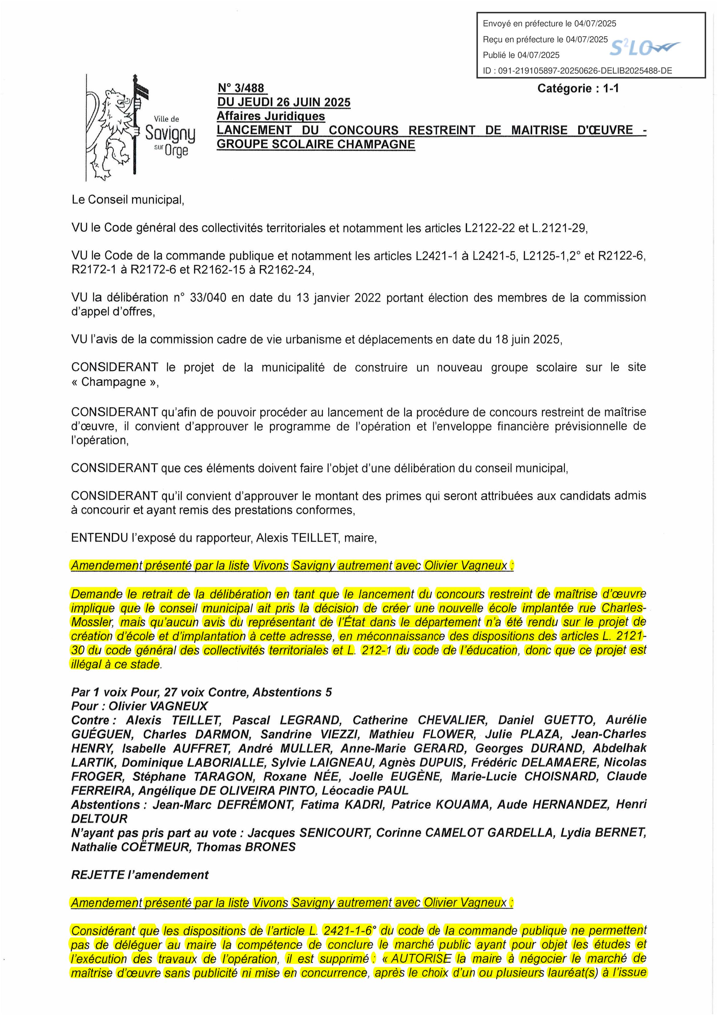 Alors que le conseil municipal avait adopté le 26 juin 2025 une délibération de lancement d’un concours restreint de maîtrise d’œuvre pour la construction de la nouvelle école Champagne,