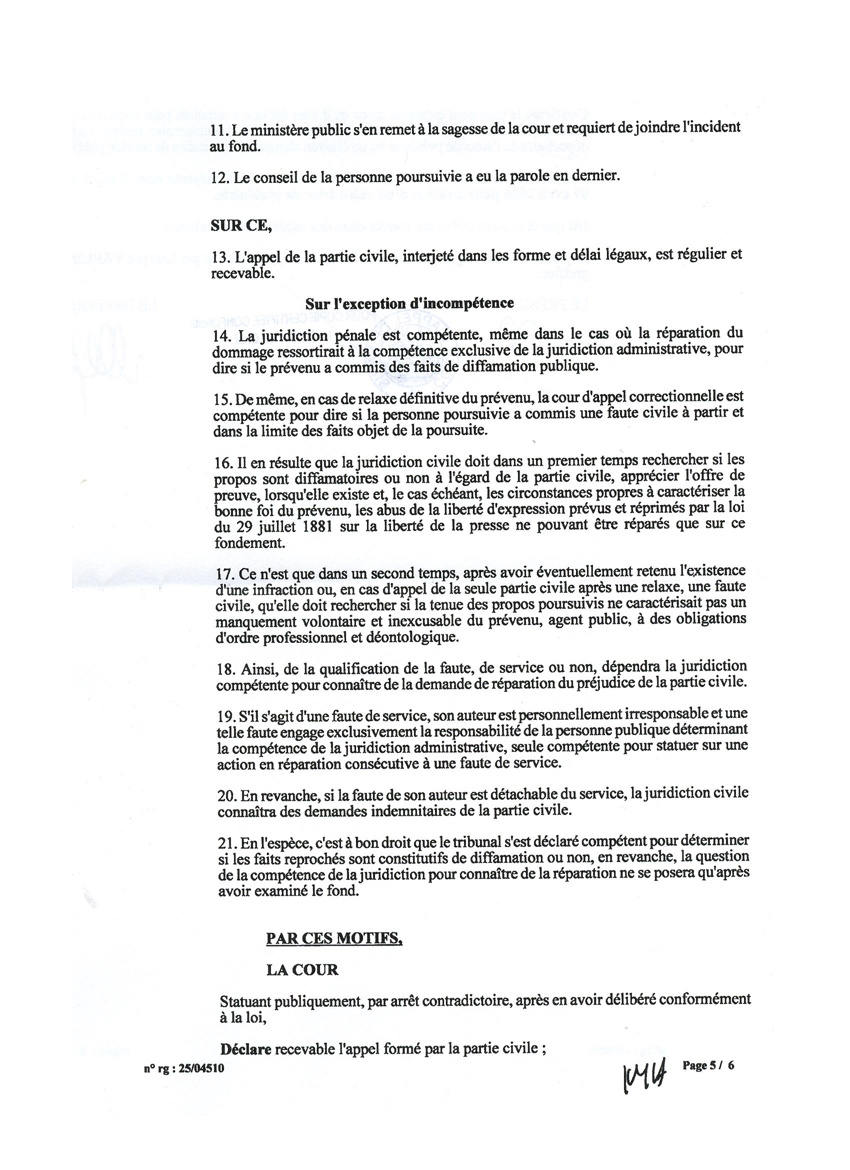 J’ai obtenu le rejet de son exception d’incompétence ; et je publie ici l’arrêt de rejet.