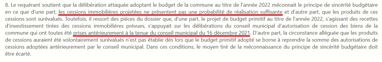 La jurisprudence financière de la Chambre régionale des comptes, qui s’impose au juge administratif, retient que la sincérité des cessions immobilières s’établit au regard de « tout document permettant d’établir que la vente se caractérise par de fortes probabilités de réalisation au cours de l’exercice » (voir par exemple l’avis no 2021/0002 du 22 juin 2001 de la CRC de Corse).
